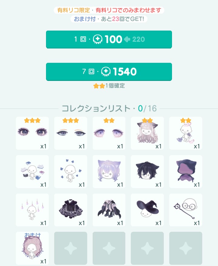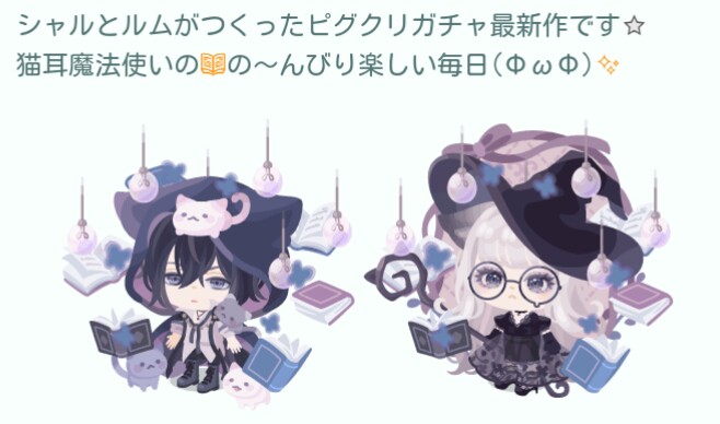 はいwでは今回は気づけば登場していたのねwと思った有料ガチャからピグクリエイターのシャルム製作「cat witch」ガチャが登場していたので記録していきますね(^_-)-☆
