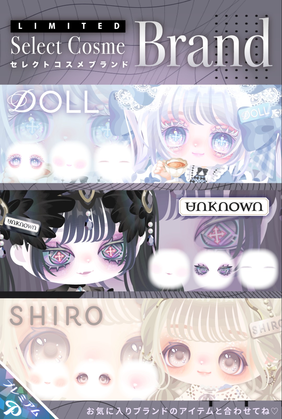 こちらではピグパブランドのDOLL UNKNOWN SHIROの 3つのブランドの顔パーツが混ざった有料ガチャより 「Select Cosme Brand」が登場したので記録していきますね(` […]