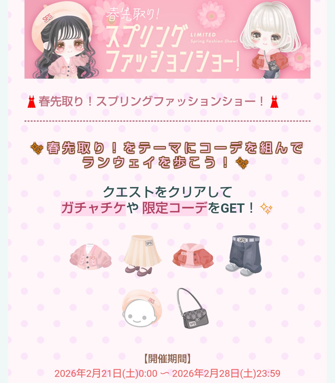 スプリングファッションショー 男物のファッションショーは無いんかいw 公開日:2026年2月21日 イベントクエスト こちらでは貰えるものが女の子アバターのみという性別限定のようなイベントクエストより 「春先取り!スプリングファッションショー」 が登場したので記録していきますね(`◉◞౪◟◉) 続きを読む