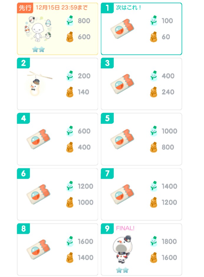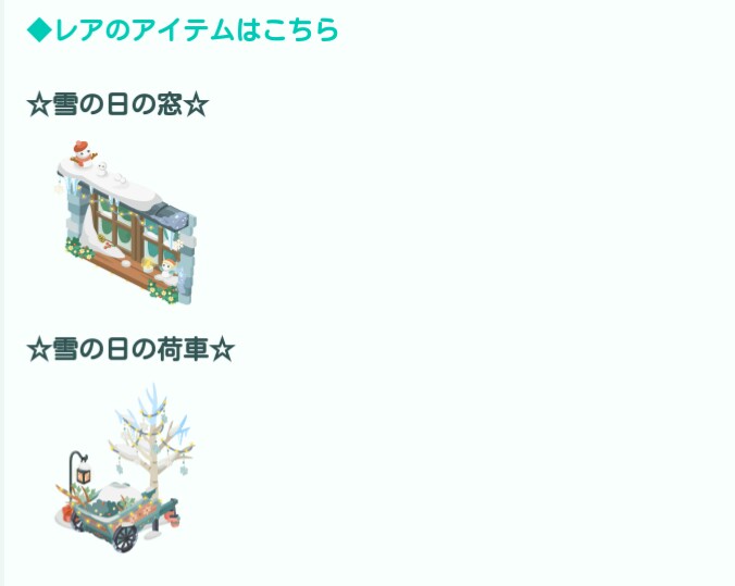 イベントクエストの方は相変わらずのきゅんとお部屋にきたよをして規定個数の通常雪だるまアイコンとレア雪だるまアイコンを集めていくだけの作業あので規定個数でのアイテム&ガチャチケ一覧とガチャ内容一覧を載せているのでご了承くださいm(__)m