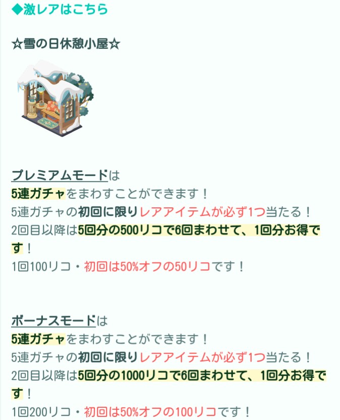 激レアは普段のガチャなら顔パーツの目などが主流なのですがこちらでは内装メインとなっているんで上手くガチャチケでこの小屋が出ればリコを無駄に使わずに部屋完成までの道のりが済みそうな感じですね((´∀`))ケラケラ