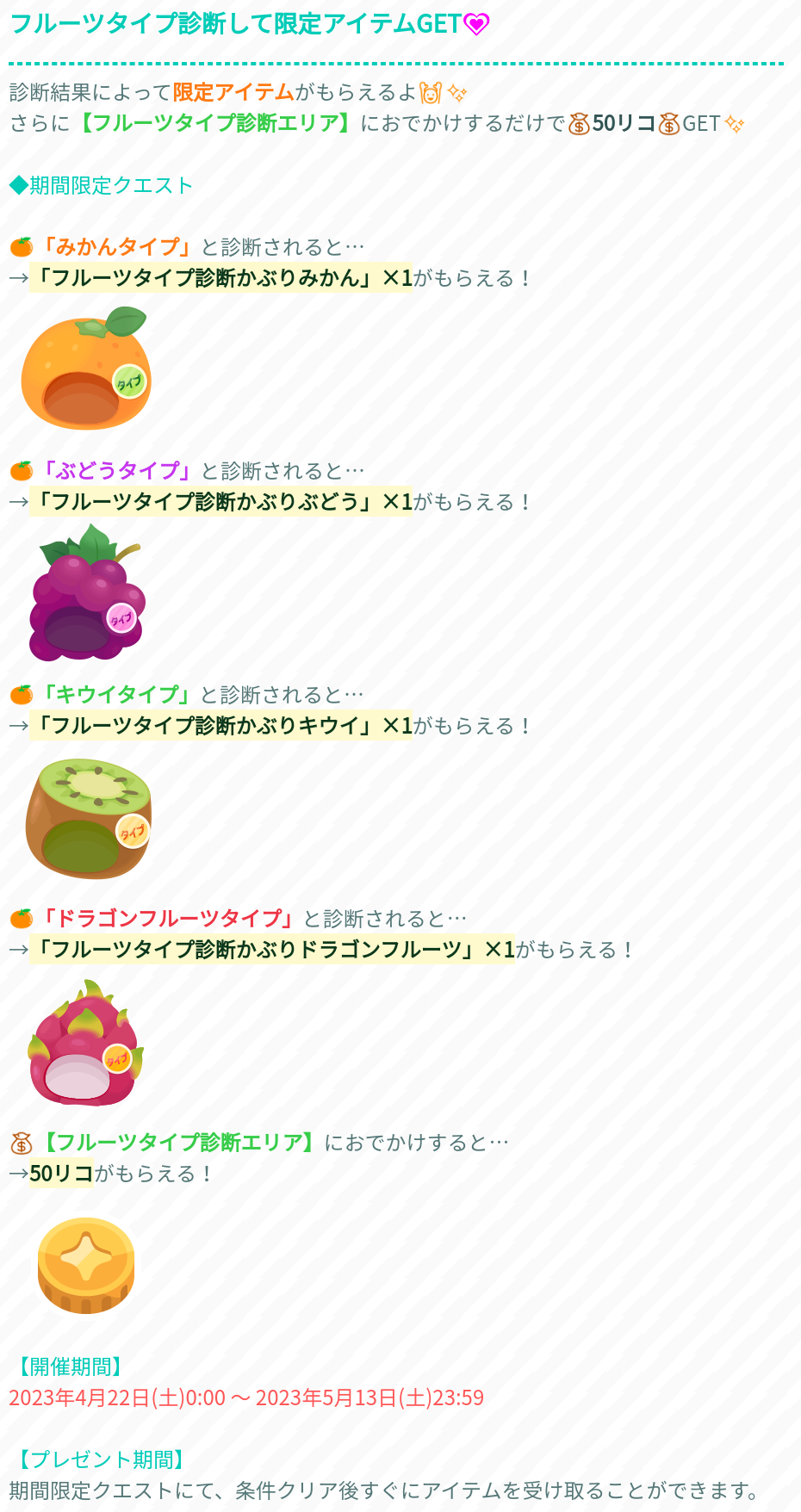 こちらでは専用エリアにてNPCの質問ではいorいいえのチャットを繰り返す事で自分の果物のタイプが出るイベントクエストより「フルーツタイプ診断」が登場したので記録していきますね(^_-)-☆