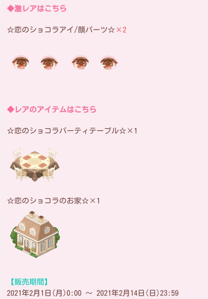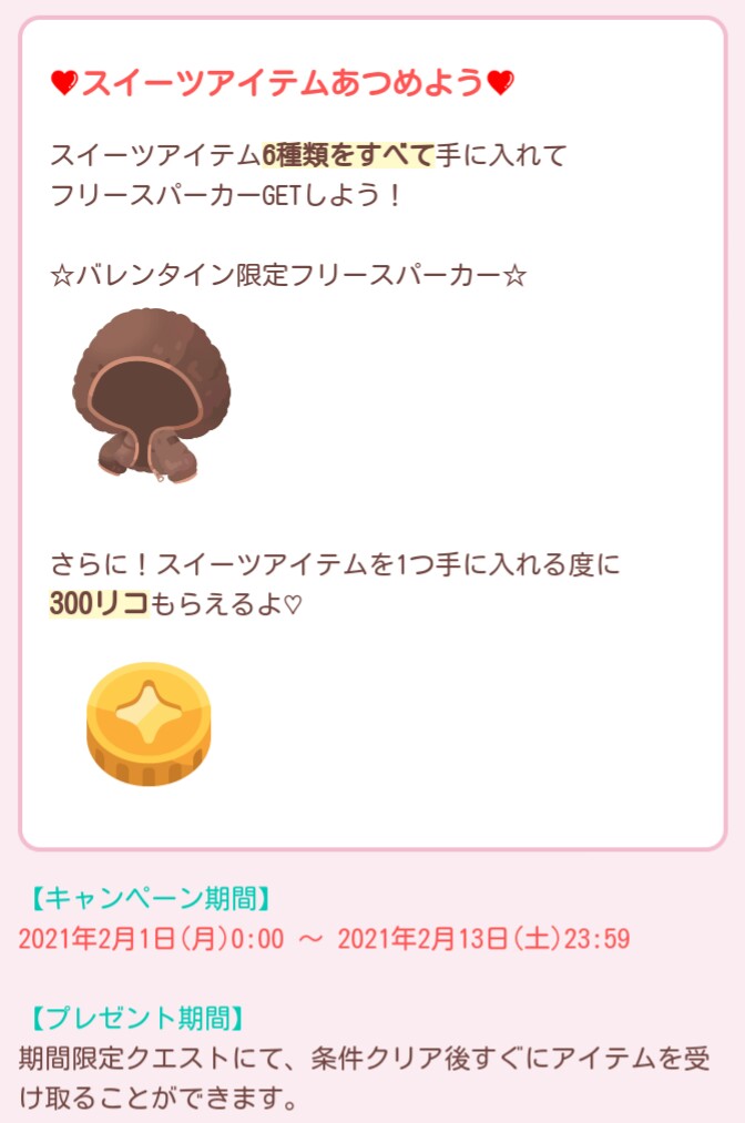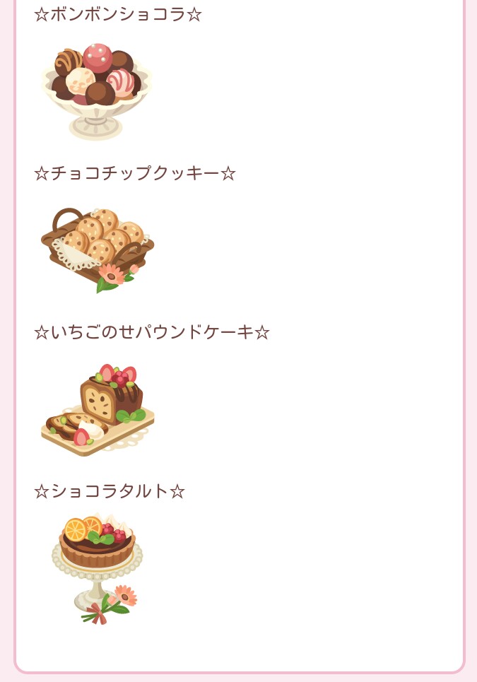 クエスト達成で貰えるお菓子のもようがえアイテムはバレンタイン専用には見えないお菓子達なのでバレンタイン以外の日にも飾りやすいアイテムなのが(・∀・)イイ!!