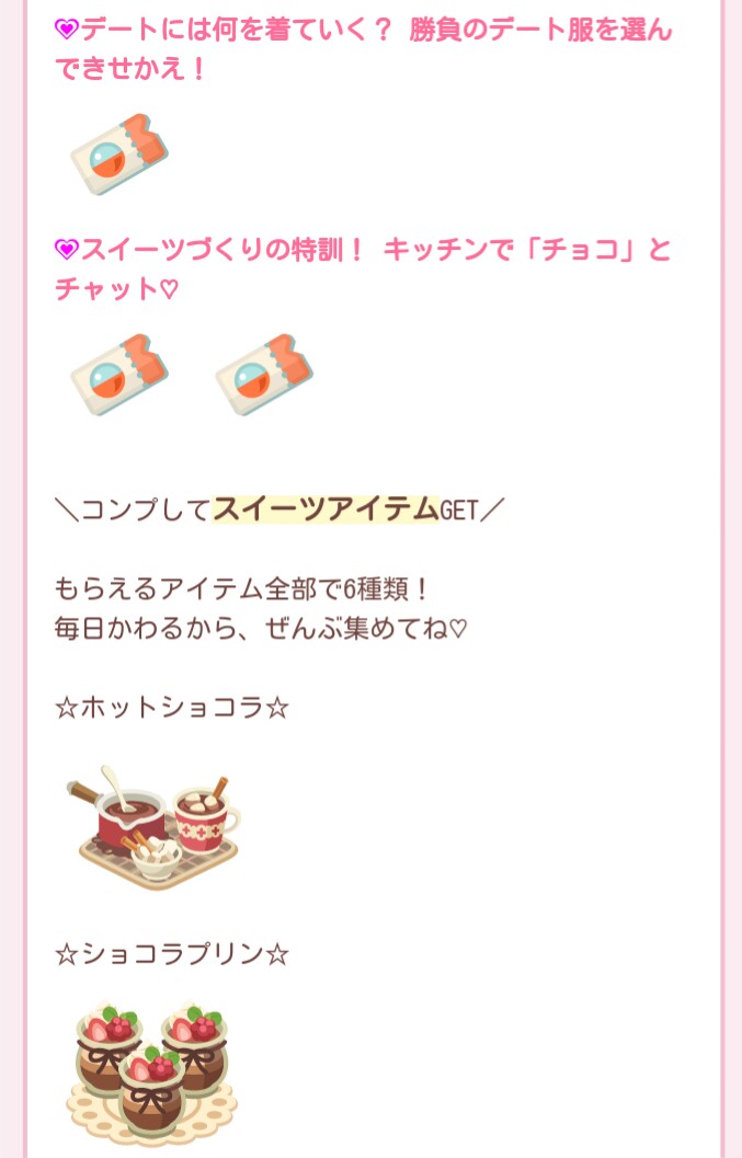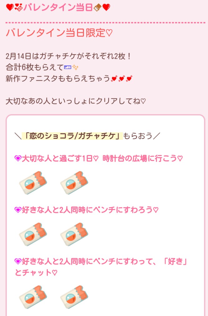 そしてバレンタイン当日には恋のショコラガチャで使用可能なガチャチケが6枚貰える&クエスト達成後にファニースタンプも貰えるのでこれ目当てなユーザーも多いんではないか?(-ω-;)ウーン