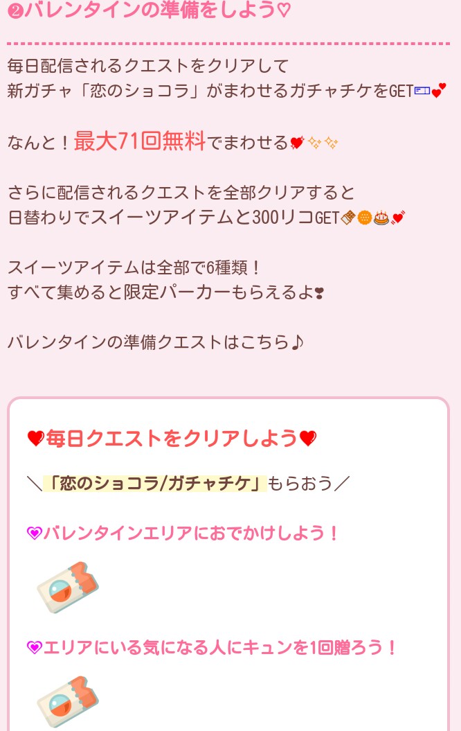 クエストクリアにてイベクエ連動のガチャ「恋するショコラ」のガチャチケがもらえてどうやら最大で71回分貰えるそうなので無料で回したいユーザーは毎日日課の1つとしてこちらのクエストも視野にいれておくと良いかもしれませんね(ΦωΦ)シランケドw
