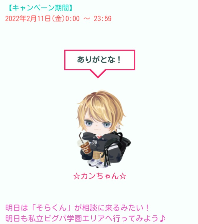 これさ、このカンちゃんイベントは当日限定でバレンタインまでまだ日付があり毎日行われるとしたら…あと何人の知らないNPCを謎に応援し続けていくんだろうか?って思うと思い入れも無いようなキャラの応援がワケワカメ状態になりそうですねwww