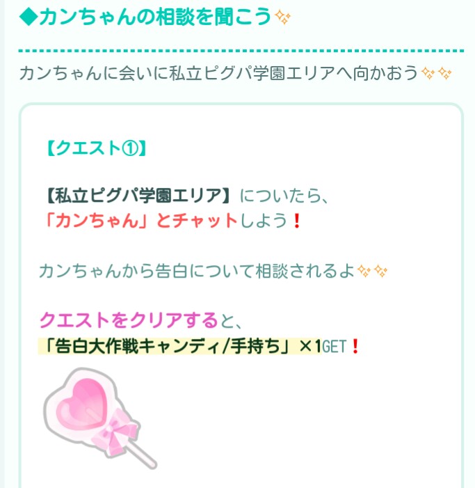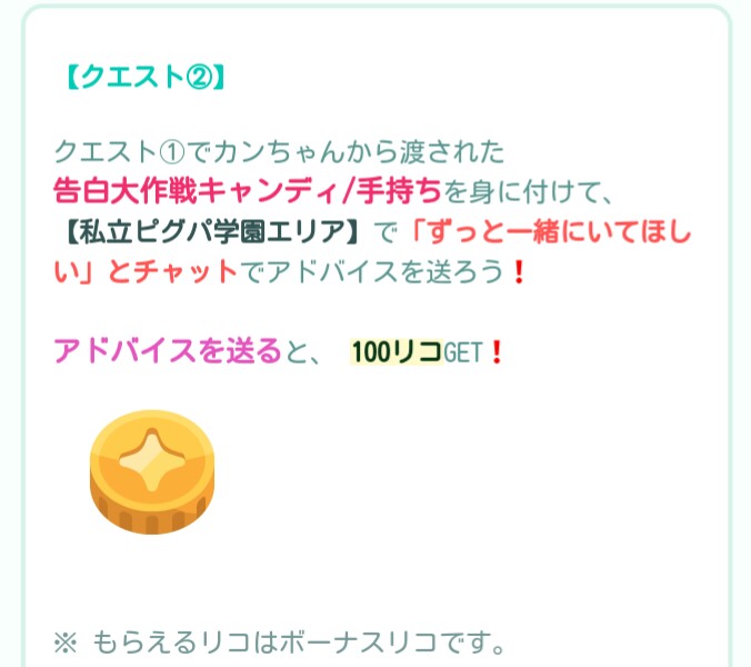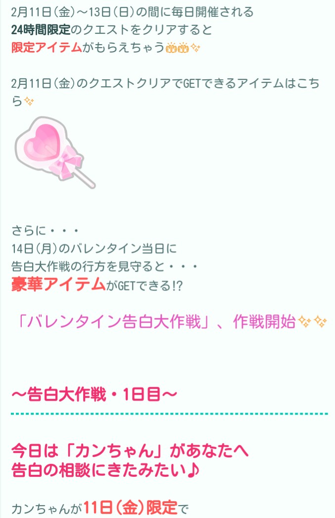こちらではバレンタインに向けてイベクエ自体がその日の当日限定な内容より「バレンタイン告白大作戦」が登場したので記録していきますね(^_-)-☆