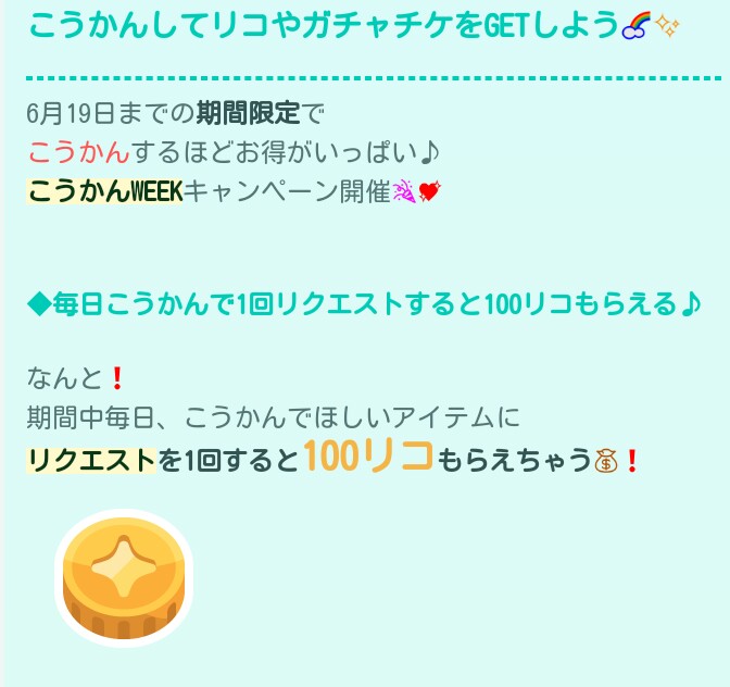 まずはこうかん機能にてリクエストをすればクエストが達成できて100リコが貰えるというクエストですw