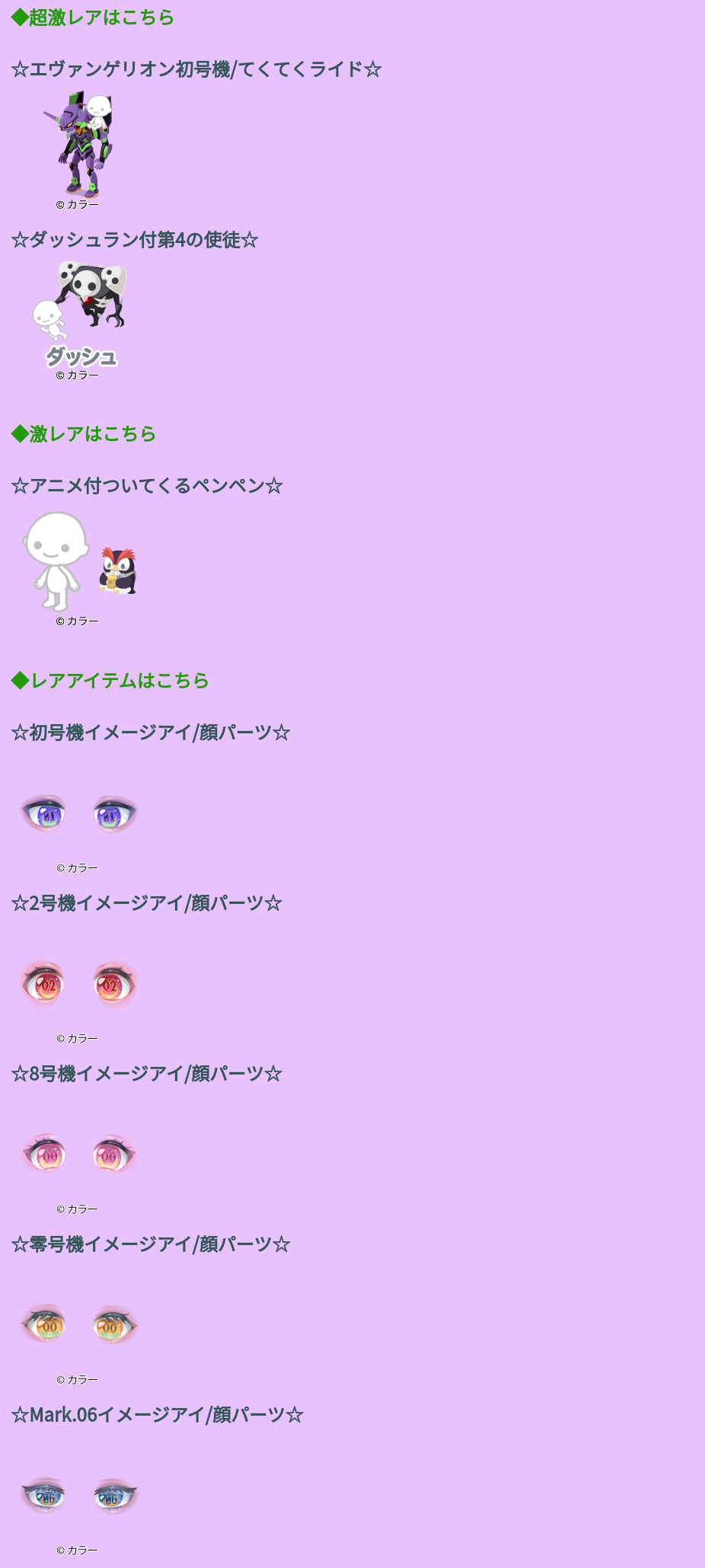 更に〜レア設定では各キャラクターではなく各エヴァをイメージした顔パーツの目という事でアニメキャラのクオリティとは違って使いやすさの雰囲気はあるし、普段から激レア固定されている顔パーツの目が全てレアっていうレアリティになっていることも〇だと思ったしレアリティが付いている物の選定にはホント👏だとは思いました( ´_ゝ`)フーンw