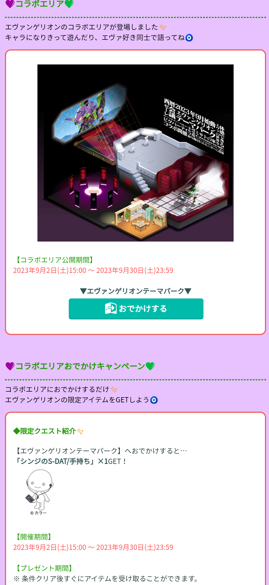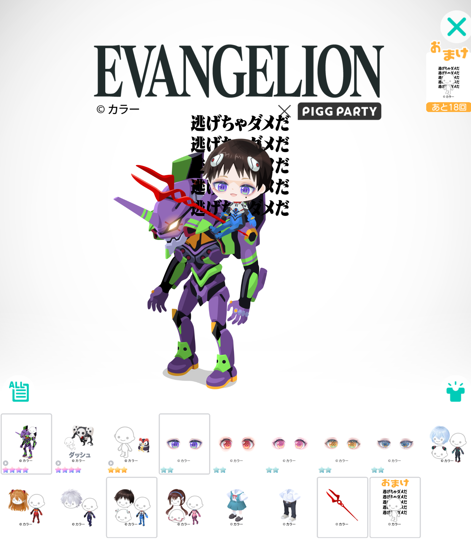 超激レア設定では以前にも進撃の巨人コラボなどであった巨人の肩乗りライドと同じでエヴァンゲリオン初号機に乗っててくてく移動できるライドアバター、そして第4使徒が後ろから付いて来るダッシュランなどピグパならではいかにも~っていうレアリティの選定は(・∀・)イイ!!とは思いましたね(´ー`*)ウンウン