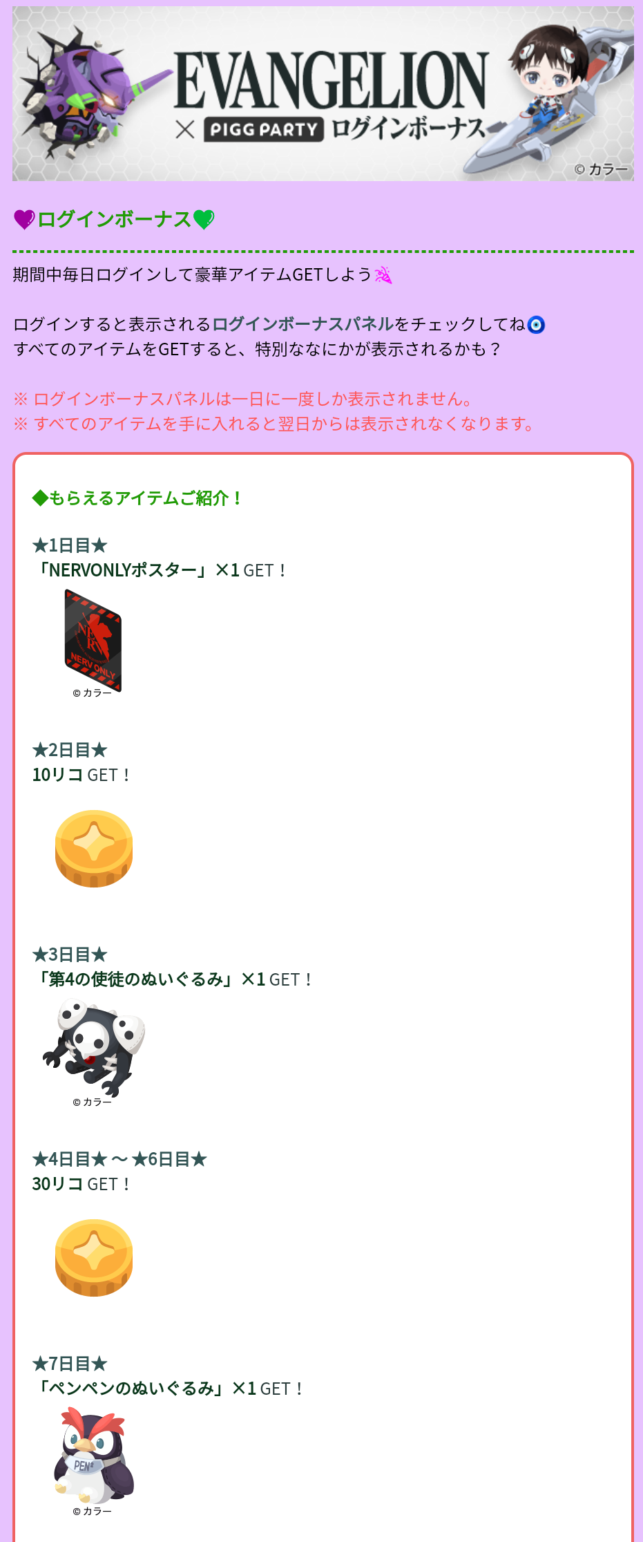 【コラボガチャ】まさか無料リコでのガチャを消すために意図的に意識してコラボしたんだろうか?w EVANGELION×PIGGPARTY【ログボ】