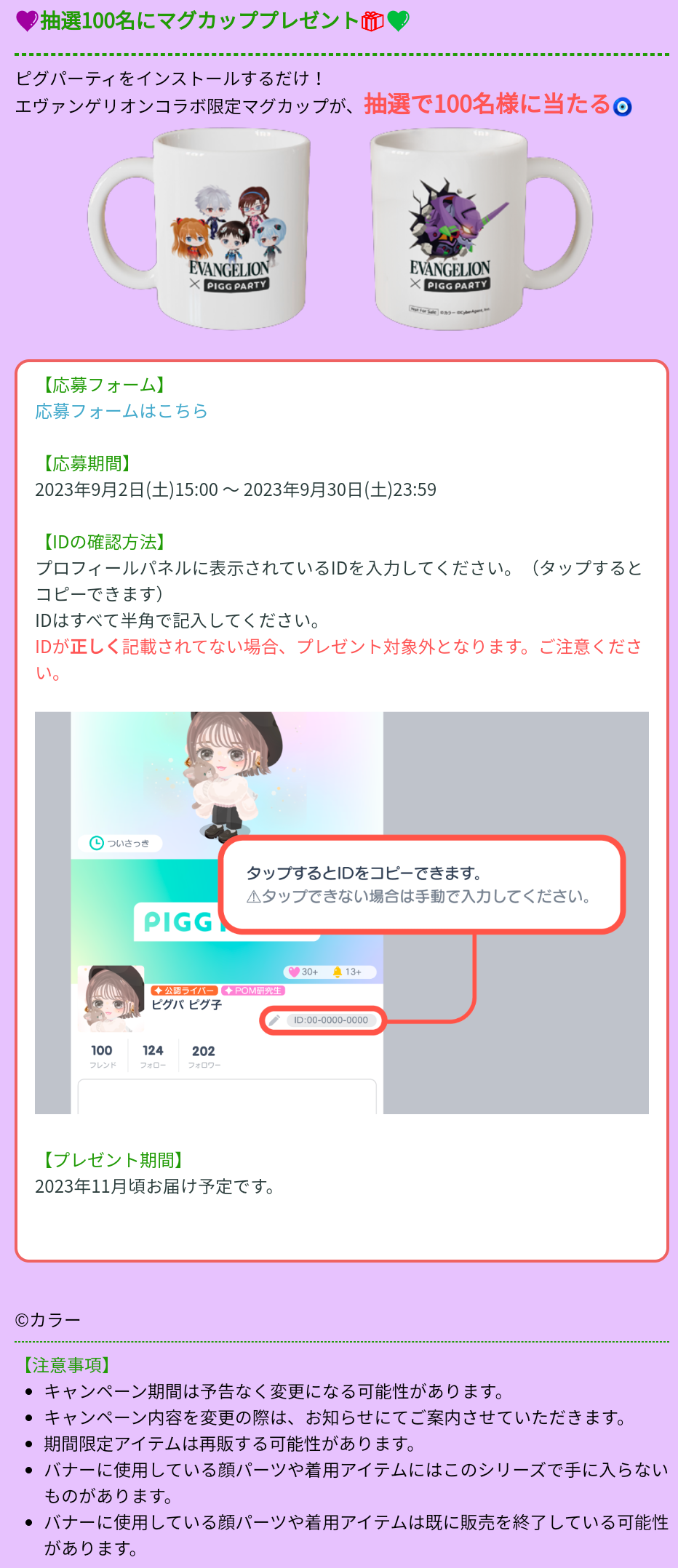 最後に~ピグパインストールしたユーザーにてお知らせ欄の応募フォームよりプロフィールパネルに表示されているIDを入力する事で抽選で100名にてピグパとエヴァのコラボマグカップが貰えるそうなので~欲しい方は狙ってみても良いかもしれませんね(ΦωΦ)シランケドw