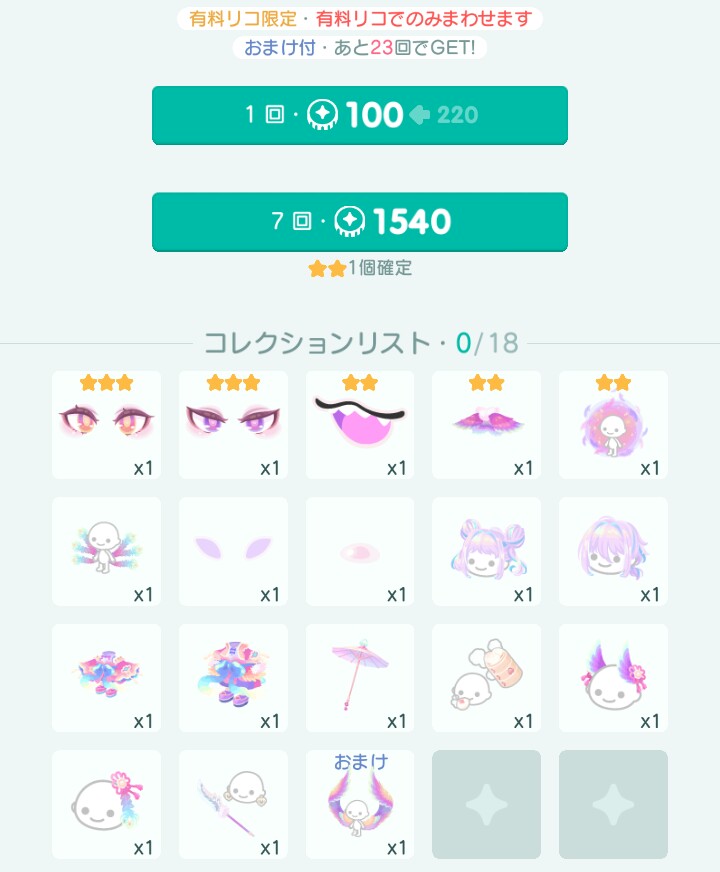 もちろんあくまでも全てのアバター&アイテムが順調にその回数で排出された場合の最小限の金額なので、激レアが出ない、レアが出ない〜などの状況は確実にあり得るので5,000円以上の課金は必須になるでしょうね((((;゚Д゚))))ガクガクブルブル
