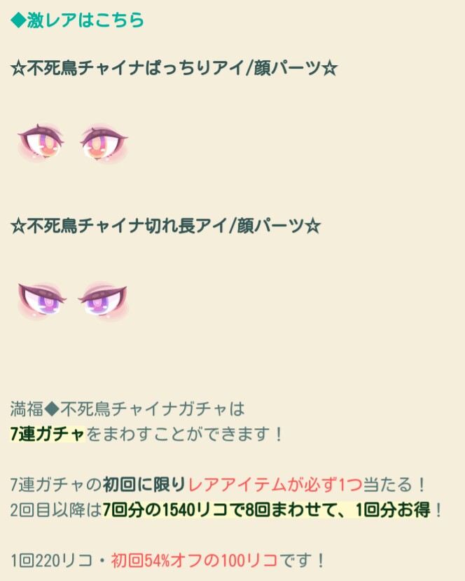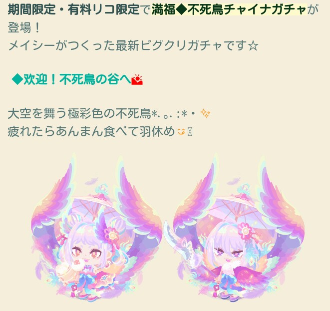 はいwというわけで今回は冒頭にも書いた通り名前が駄々被りなのか製作者が同じクリエイターだったのか分かりませんが有料専用ガチャとして新ピグクリ製作の「満腹 不死鳥チャイナ」ガチャが登場したので記録していきますね(^_-)-☆