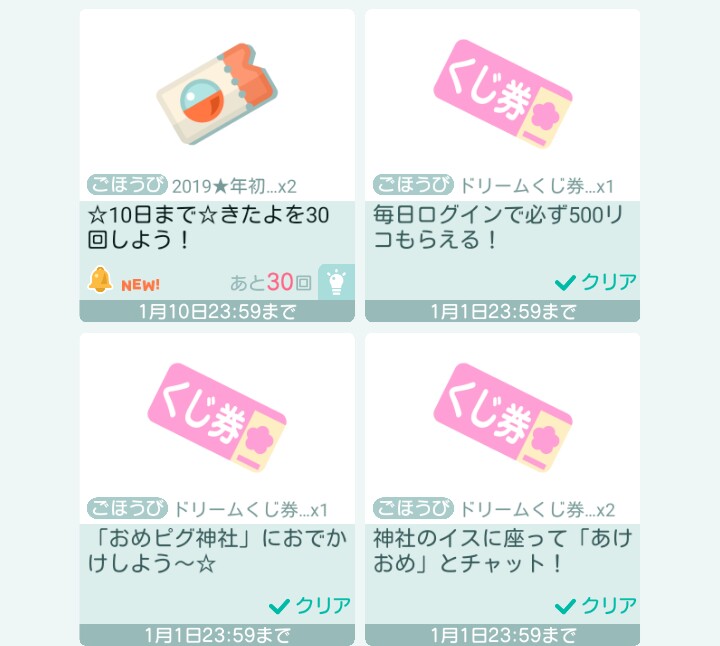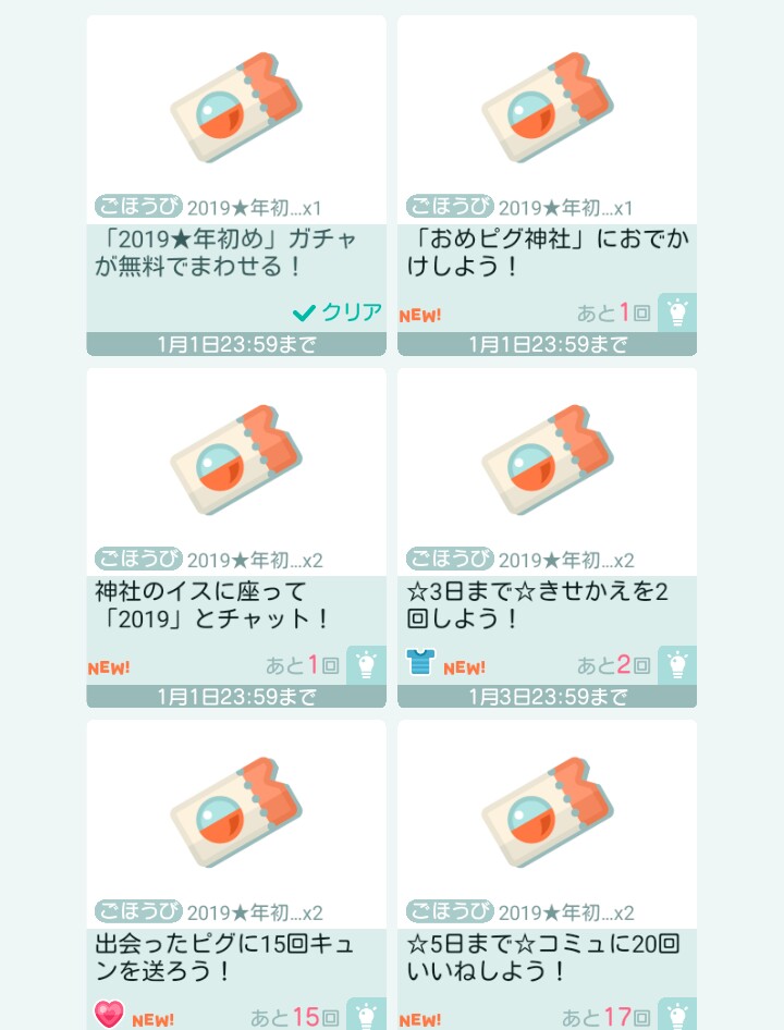 年明けから1時までの間に量産型クレアが各神社ランダムに一定の時間徘徊しその量産型クレアにキュンをするともらえる1時間限定アイテムクエストが発動しましたが、これも見事に運営はやらかしていて約400あるおめピグ神社がほぼ満員になるという状態で「クレアにキュンしたのに貰えない…」などのバグが発生しこちらもプチパニックでしたw
