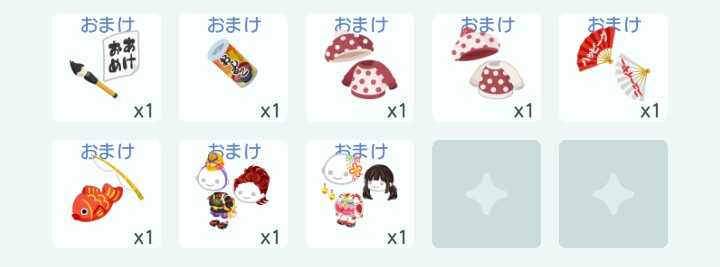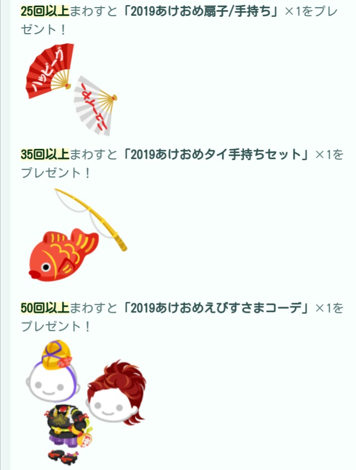 そしておまけの量が尋常じゃないくらいあってラスト付近のおまけが年明けの幸福感を更に加速させるセットアップ一式があるのでどうせならここまでもらえるくらいクエストをこなしてガチャチケを回収しておきたいところですね(=゚ω゚)ノホスィ~エビッサン
