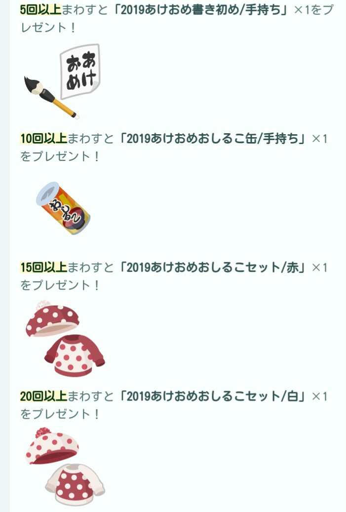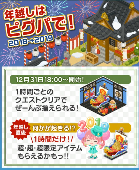 こちらのイベントは新年を迎えるための内装アイテム一式が2018年12/31の18時(夕方6時)より年明けまでの1時間毎にもらえるという内容です(‘ω’)ノ