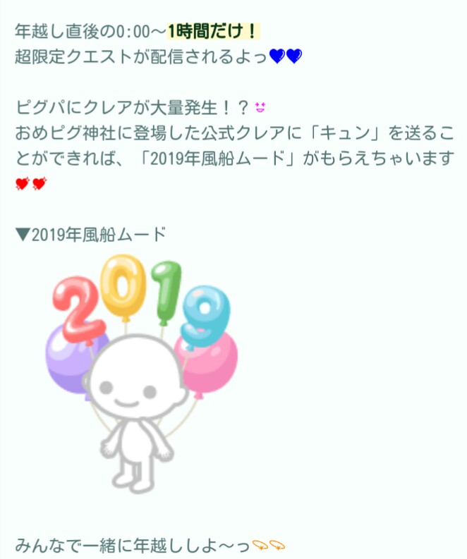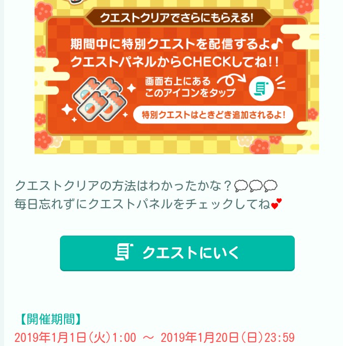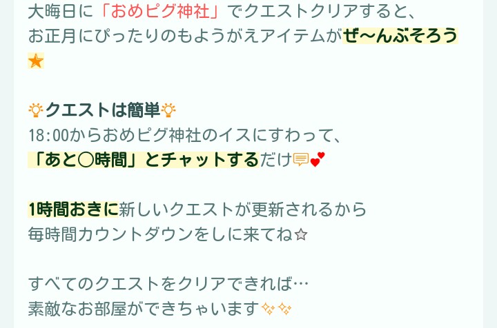はいwクエスト内容はおめピグ神社にてチャットだったり出向いたり、そして通常クエストと連動した流れできたよやキュンを規定回数こなすと貰える仕組みみたいです( ..)φメモメモ