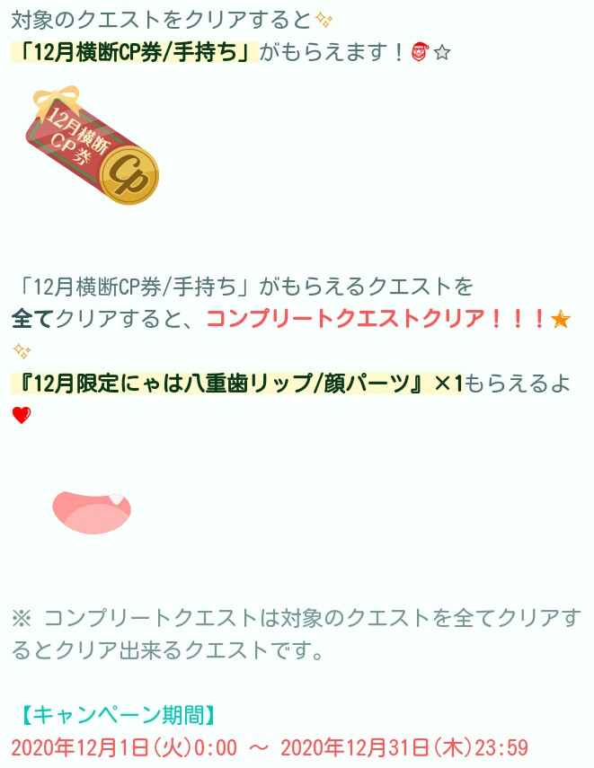 今月の横断キャンペーン内容では無料回収1、有料回収2という課金者ユーザー限定な口パーツ回収イベントになっているんで無課金ユーザーは課金という敷居が高いので存分に楽しめないイベントキャンペーン内容となっています(´・ω・`)