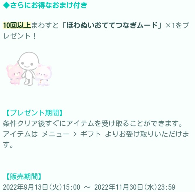 おまけ内容では恒例化の初回の連ガチャではもらえない10回という鬼畜搾取回数でしかも貰えるものが手つなぎムードという事で、普段から手持ちで出ていたぬいぐるみがムードにお株を奪われるという形になってきたので手持ちの必要性がドンドン無くなってきそうですねΣ(゚Д゚;エーッ!
