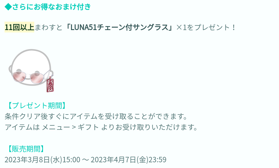 おまけ内容ではまたしても初回の連ガチャで11回以上でこのサングラスって言う事自体が正直おまけ要素にも思えない回数設定だと思うだけどもはや1万円以上使わない課金者ユーザーは課金者ユーザーだと運営より認知されない差別になってきたんでしょうかね?(ΦωΦ)シランケドw