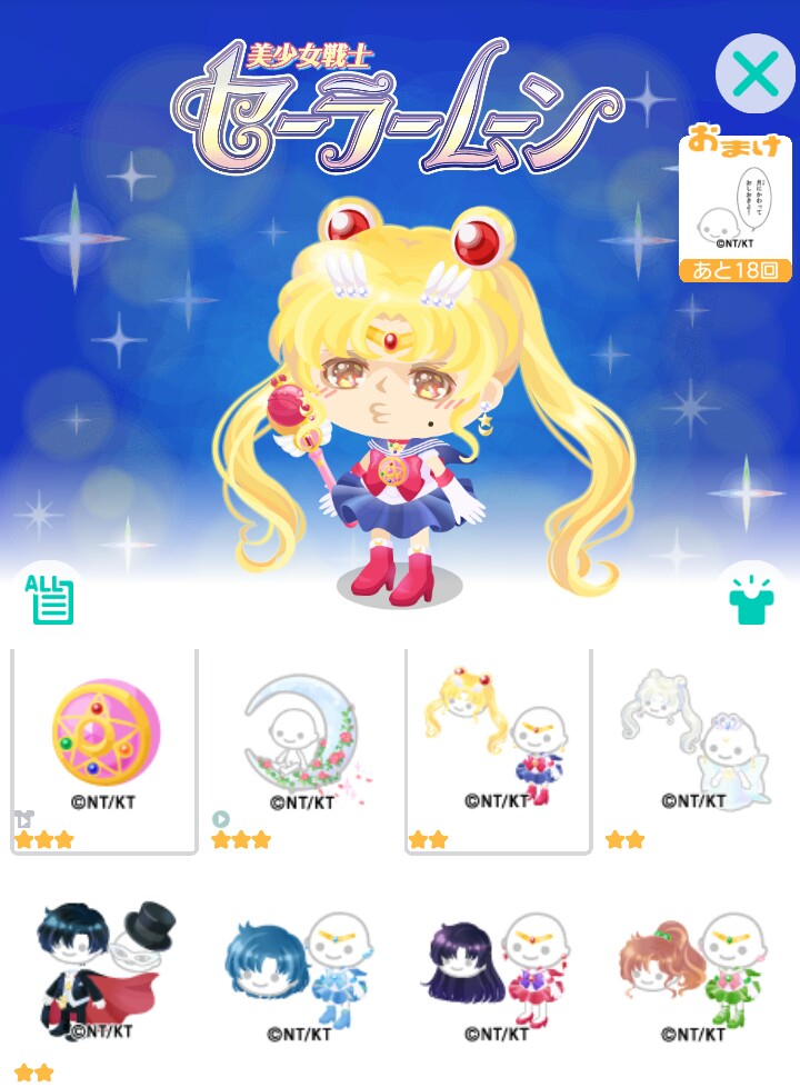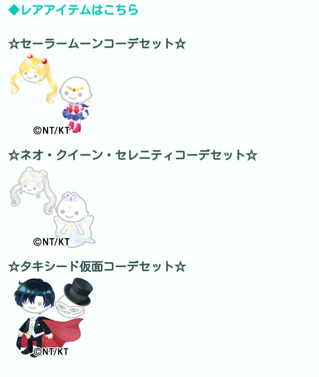 レアからはみなさんご存知の通り、主人公のセットアップとその旦那になるタキシード仮面のセットアップ、そして月の女王(ダデェはそこら辺は知らん)のセットアップと豪華アバターになっている模様です。