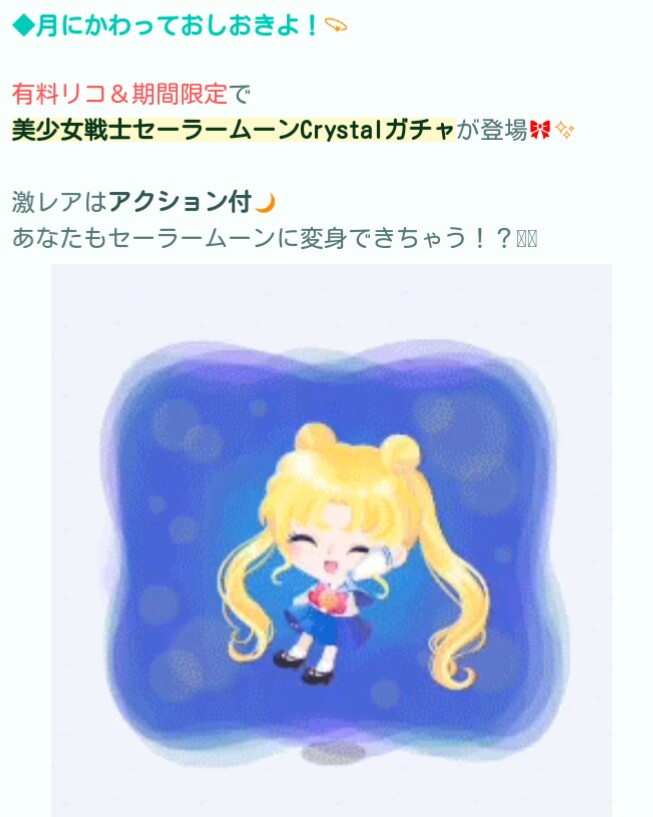 はいwでは今回は冒頭にも書いてある通り、超有名アニメセーラームーンとピグパがコラボした内容から有料ガチャとして「セーラームーン」が登場したので記録していきますね(^_-)-☆