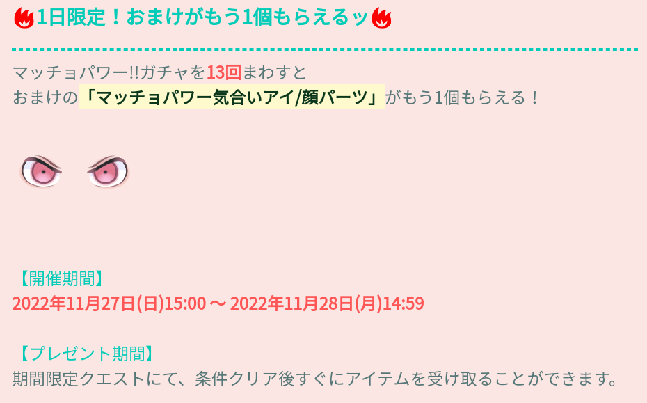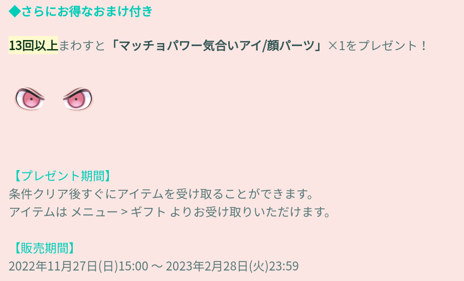 規定回数でのおまけと販売期間+24時間限定クエストで顔パーツの目