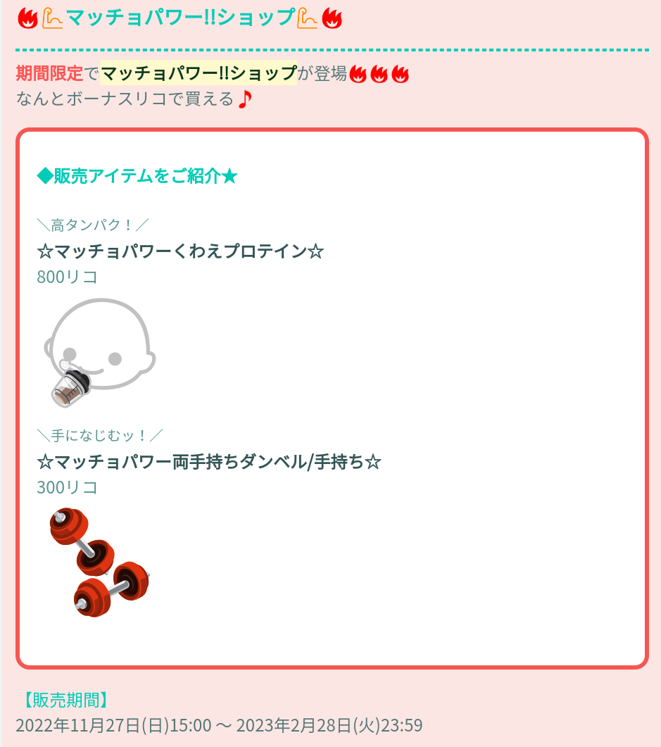 今回のマッチョパワー!!ガチャでは無料リコでも購入のできるショップが出た━━━━(゚∀゚)━━━━!!のですが内容は上記のみで