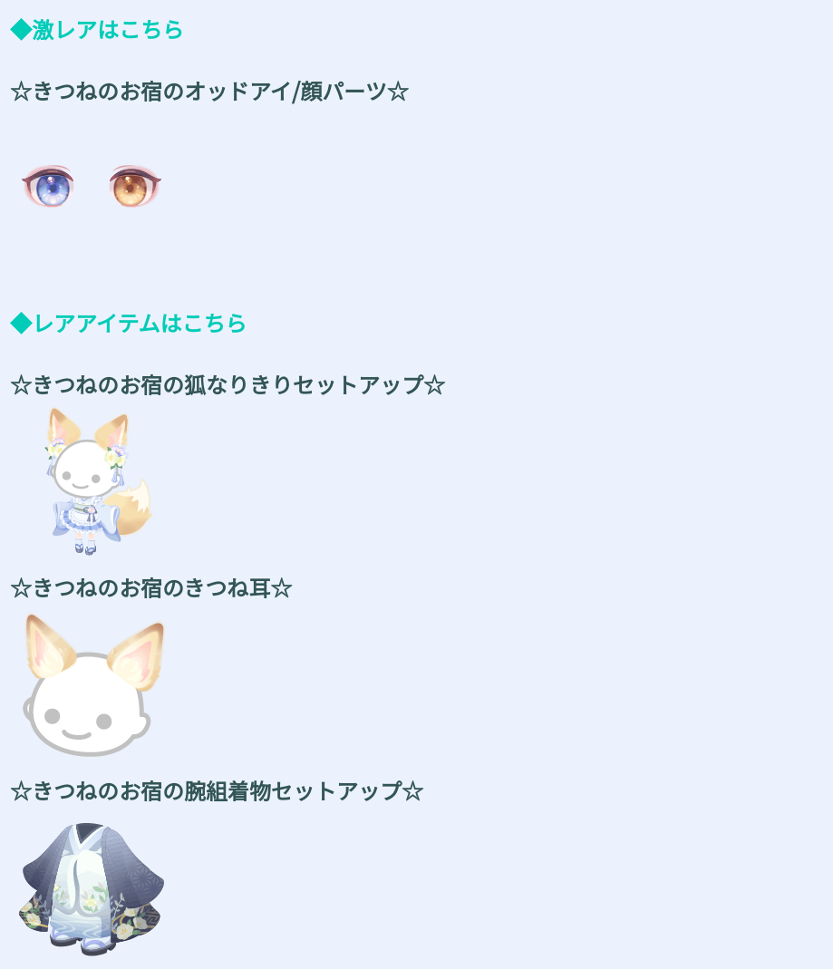 レア設定ではきつねの耳付なセットアップだったり着物だったりと一応今回のモチーフに沿っているという点では〇なんだけど~色使い以外が無料クオリティレベルのデザインに見えるのでそこら辺をしっかりと区別してみるとホントに欲しいと思えるようなものなのかが見えてきそうですね(ΦωΦ)シランケドw