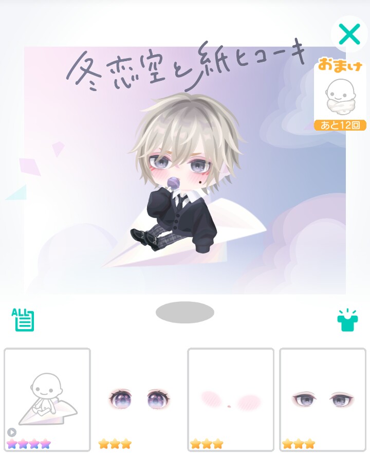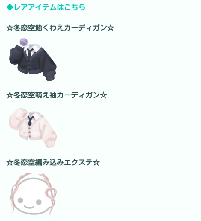 レア設定では学生ネタという事を全面的に推し出したかのように、そしてくわえ口の飴が人気だったのを+して最初っからカーディガンと飴を咥えているのをセットにしたアバター+地味にエクステ機能を追加していたのを拡散しつつあるようなアバターとなっています。