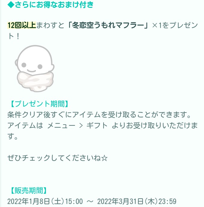 はいwおまけ内容は相変わらずの搾取スタイルで、初回の連ガチャでは届かず+シングル回数でもきわどい12回となっているので実質連ガチャ2回分は必須って感じの鬼畜内容となっていて本チャンの未成年者の学生さん達は約3,500円ほど課金しないと貰えない仕様となっているのでお年玉をもらってウハウハな気持ちでぶん回しちゃうと後悔しか残らないと思うのでしっかりと計画的に課金するなりして遊ぶ事をおススメします(-_-)/~~~ピシー!ピシー!
