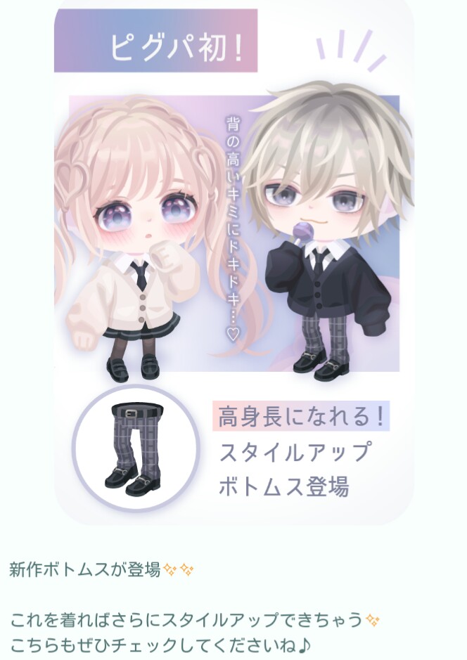 遂にピグパでも身長が変わるようなアバター要素を盛り込んできていてしかもそれが課金者ユーザーだけというクソ仕様になっているんですΣ(゚Д゚;エーッ!