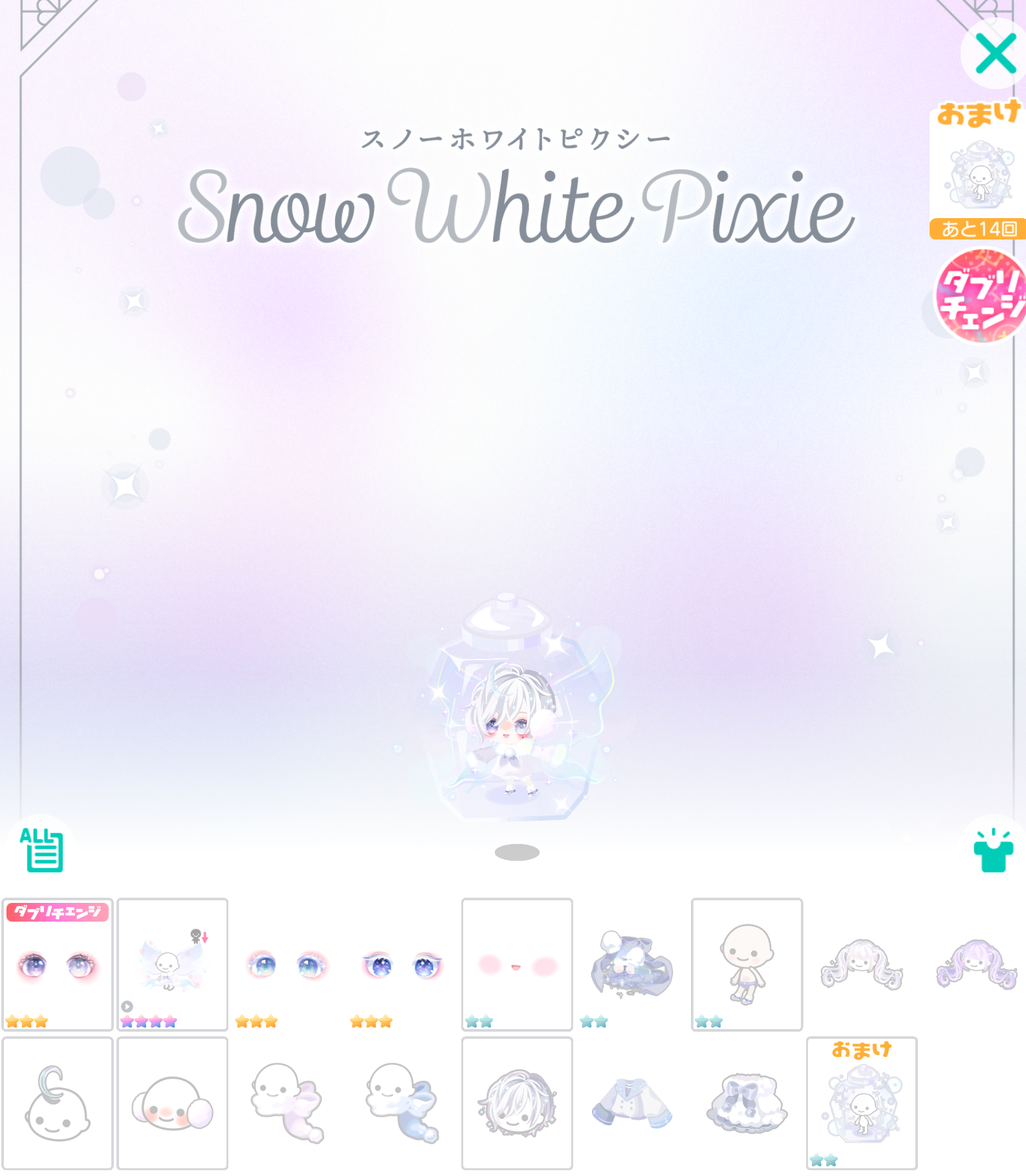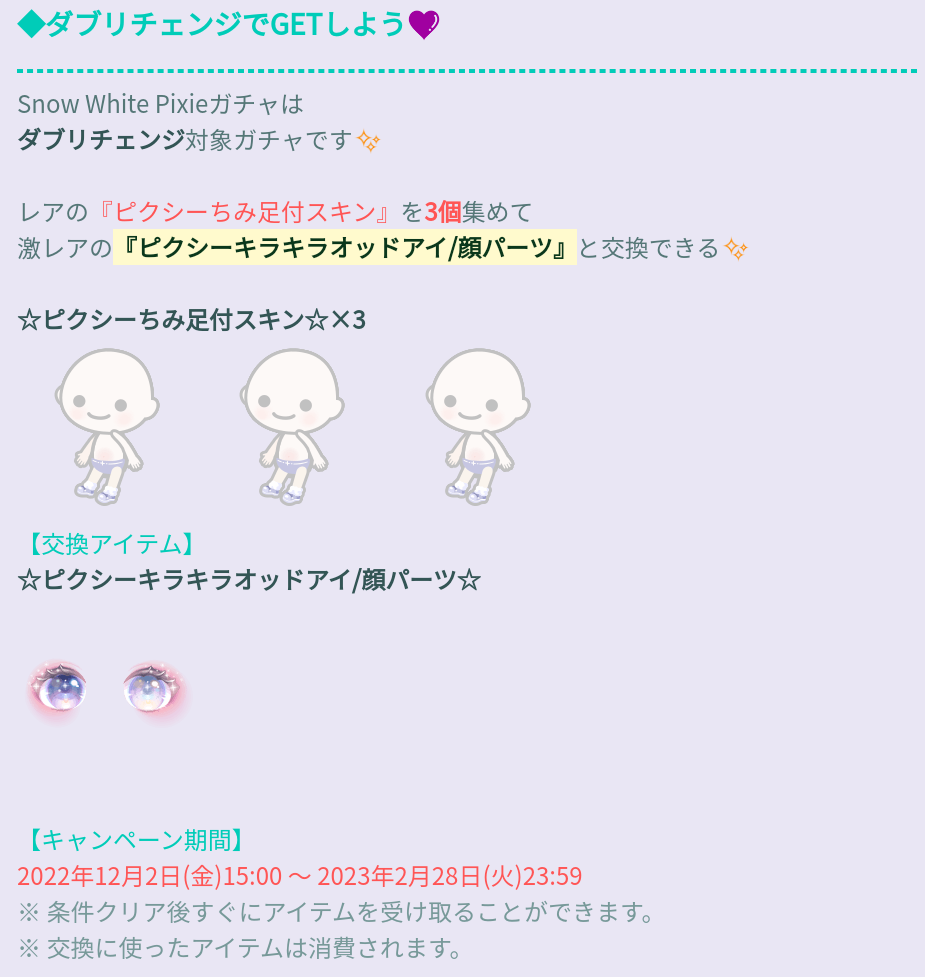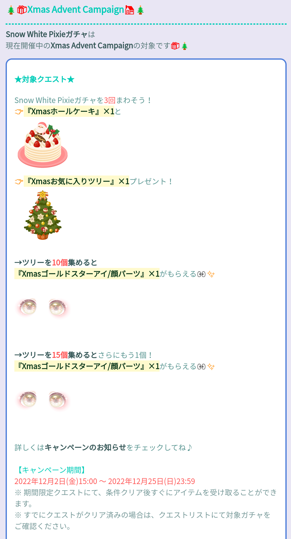 横断キャンペーンではスノーホワイトピクシーガチャを3回回す事でケーキとツリーが1個ずつ(σ・∀・)σゲッツ!!できるという事でそのツリーを規定数まで集める事で顔パーツの目が貰える課金限定キャンペーンとなっています( ´_ゝ`)フーン