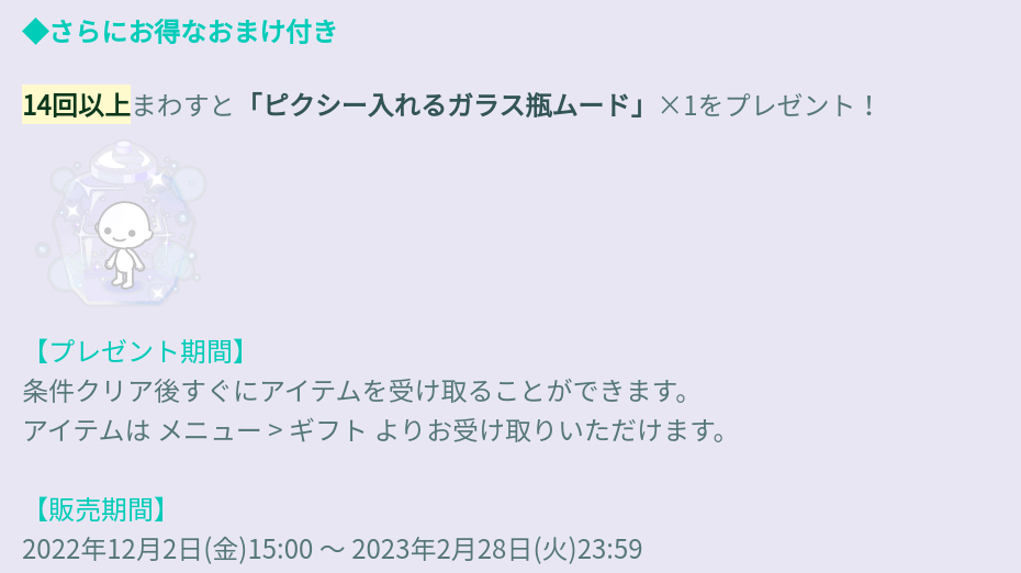 おまけ内容では入れるムードっていう名前なくらいで正直普段のムードと特にアピール出来る程でもないアバターが連ガチャ2回分でも届かない14回(連ガチャは6連)という回数設定では全然おまけとは呼べない内容で毎回ウンザリしてきます┐(´д`)┌ヤレヤレ
