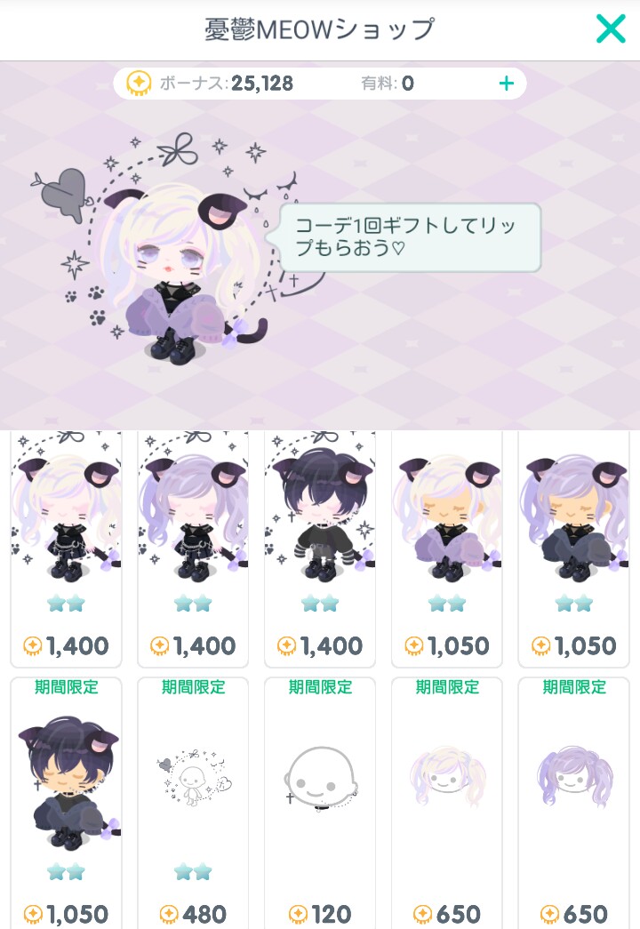 低い価格のコーデで1,050リコ、約1,100円、高い方の価格で1,400リコ、約1,400円ってなっているんで口パーツを貰おうと思う場合は、最低でも約2,500円の課金が必須となるようですΣ(゚Д゚;エーッ!