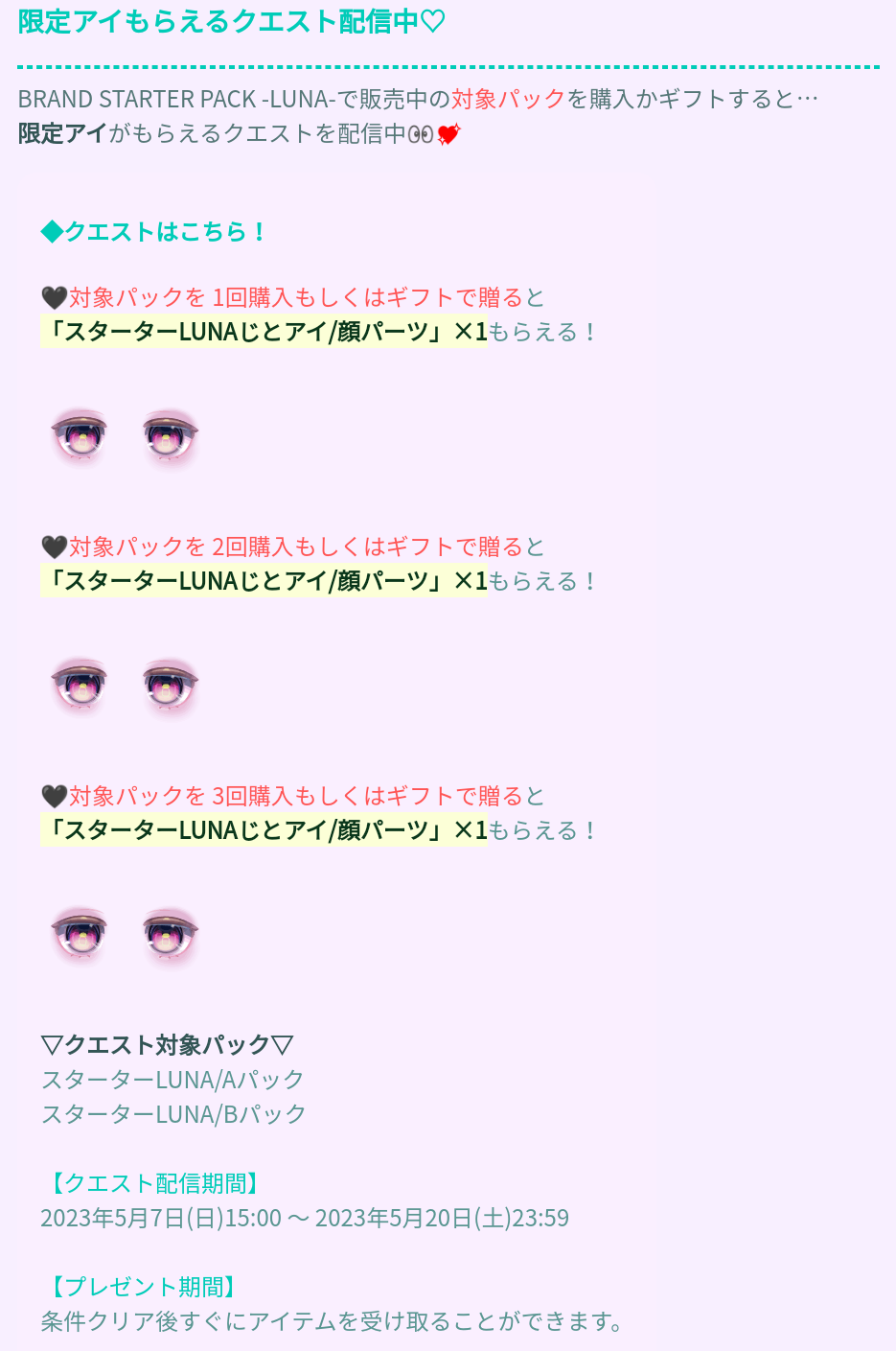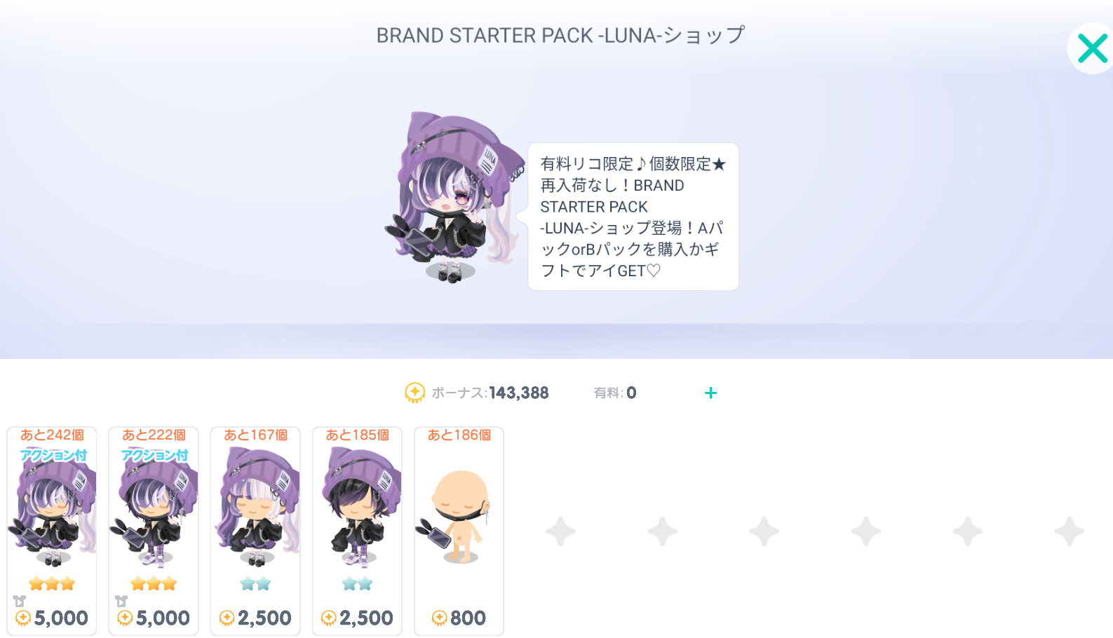 こちらでは人気ブランドのLUNAよりコーデ一式のアクション内容も含まれるスターターパック内容の有料ショップより「LUNA BRAND STARTER PACK」が登場したので記録していきますね(^_-)-☆