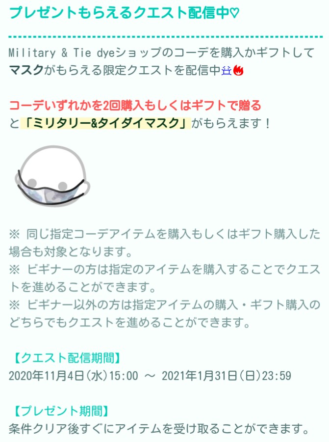 最近の運営のちょっと変わったなぁって思える事の1つとして、今回のようにマスクがギフトクエストだったりで、普段のように顔パーツの目だけじゃないところが◎だなぁって感じですね(ΦωΦ)シランケドw