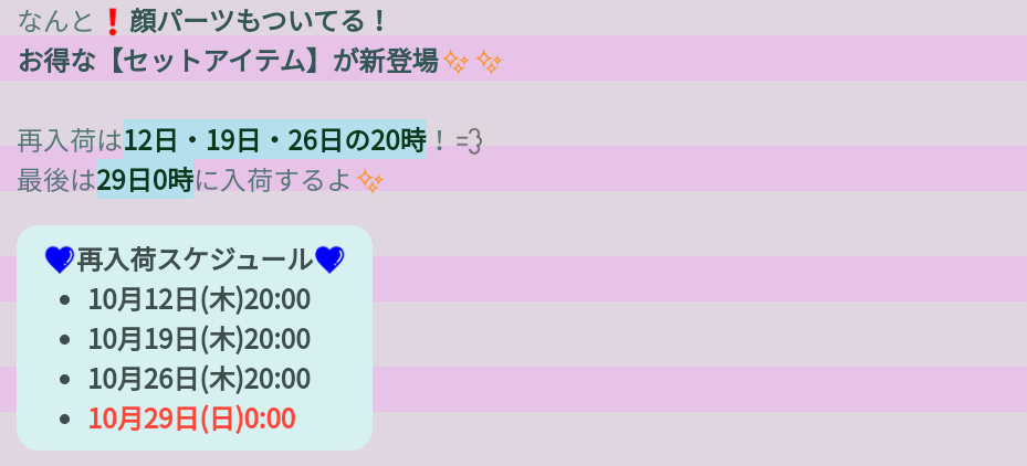 まぁこれを見ているユーザーの方々は大半が課金者なのでしょうから上記の再入荷日程や時間などのチェック、そしてギフトクエストで何が貰えるのか~の確認がほぼなんだと思うのでそこら辺だけしっかりと確認しておけばいいと思います(´ー`*)ウンウン