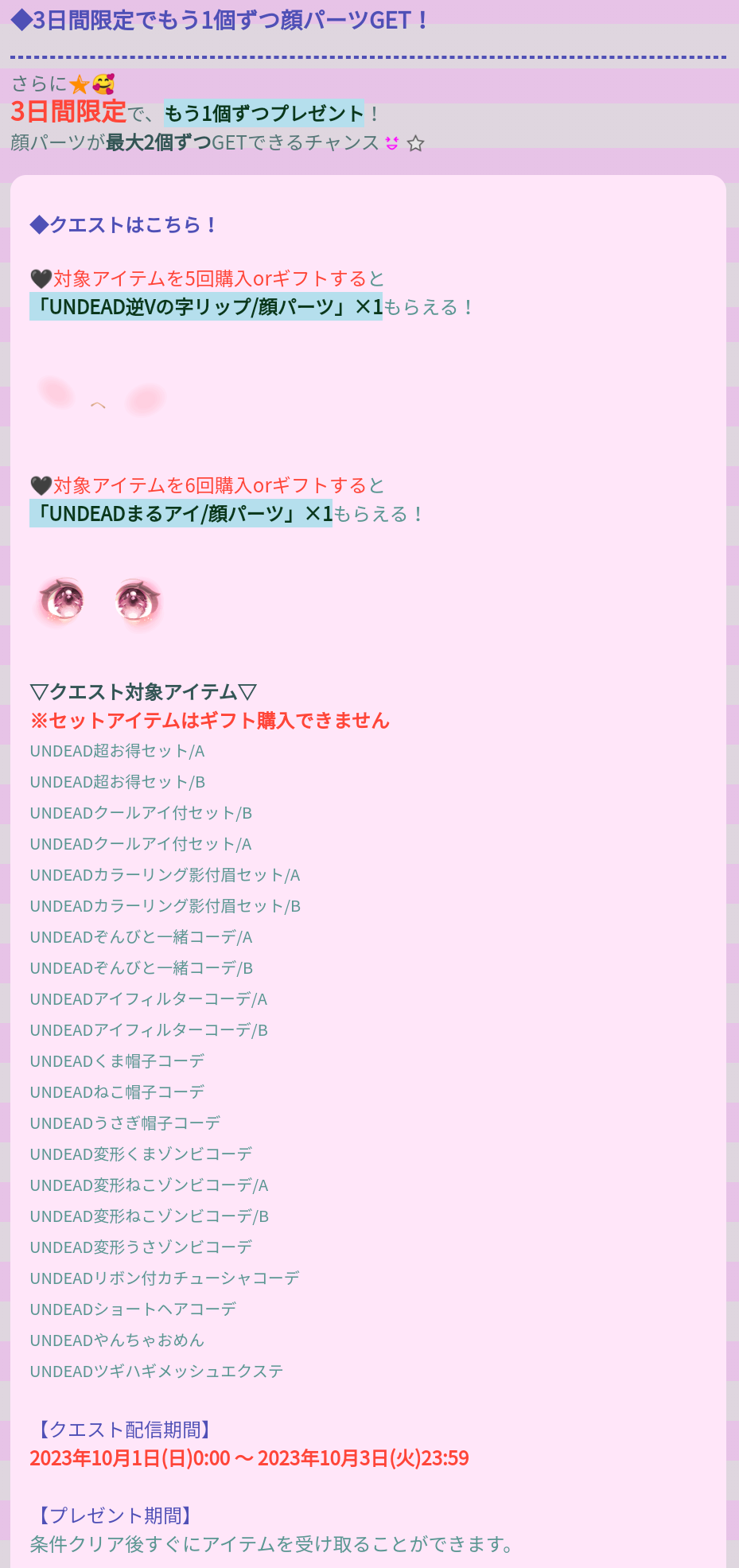 ギフトクエストでは初の顔パーツと口パーツの組み合わせとなっており珍しいパターンだなぁって感じにはなっているんだけど3日間限定クエストも含めて結局高額課金しないといけないくらいの購入回数なのでこれらを手にすることができるのはガッツリ課金者ユーザーしかないんだろうなぁって思いました( ゚д゚)アーネ