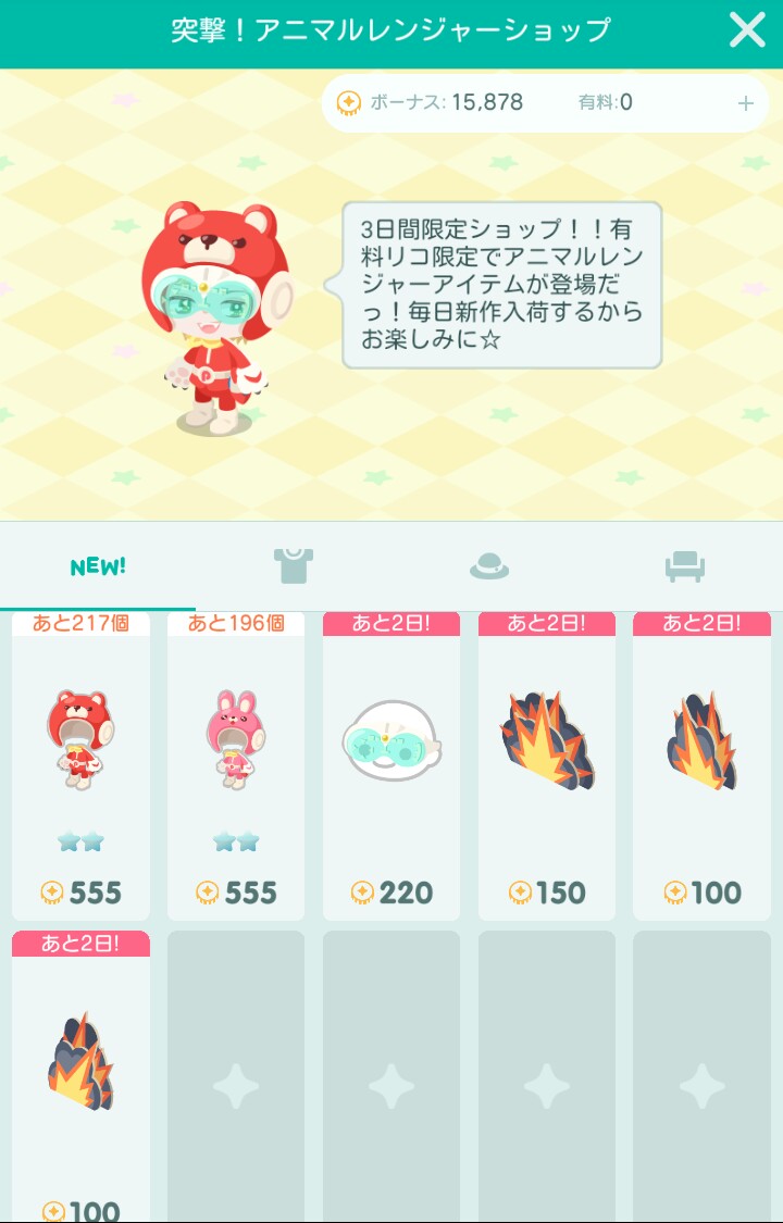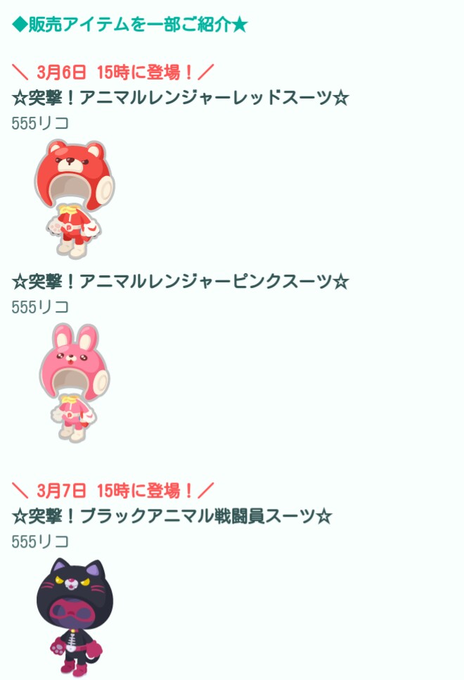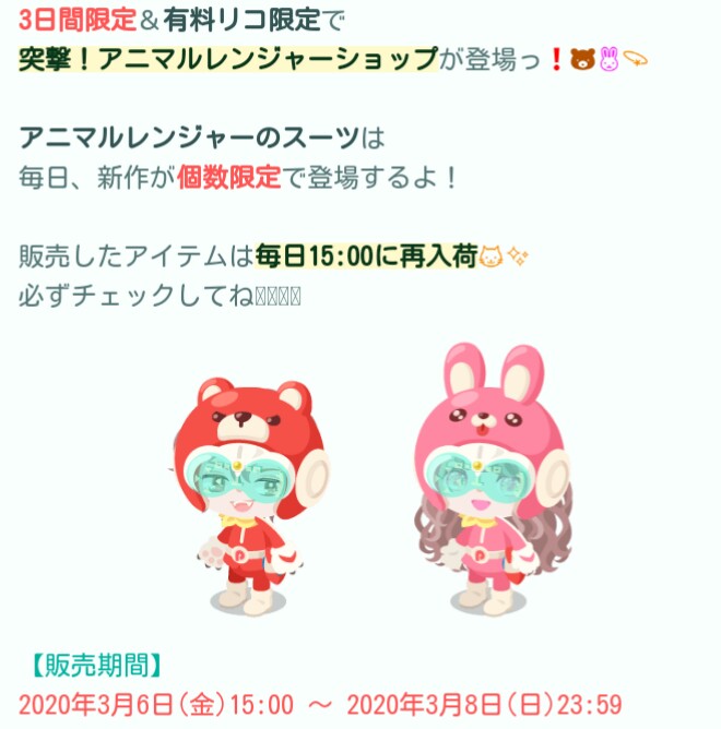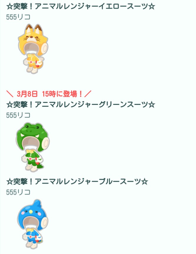 どうやら運営は新しい売り方として、その1つの内容を3日に分けて毎日新作物を登場させるということをやりだしたようですが、ぶっちゃけ登場から次の日、その次の日に別の新作を出して来たらもうアニマルレンジャーどころの話題にはならないでしょうしね((´∀`))ケラケラ