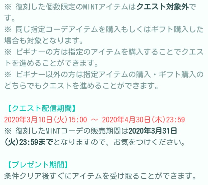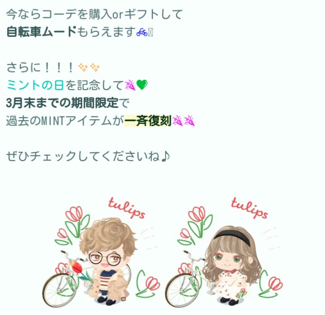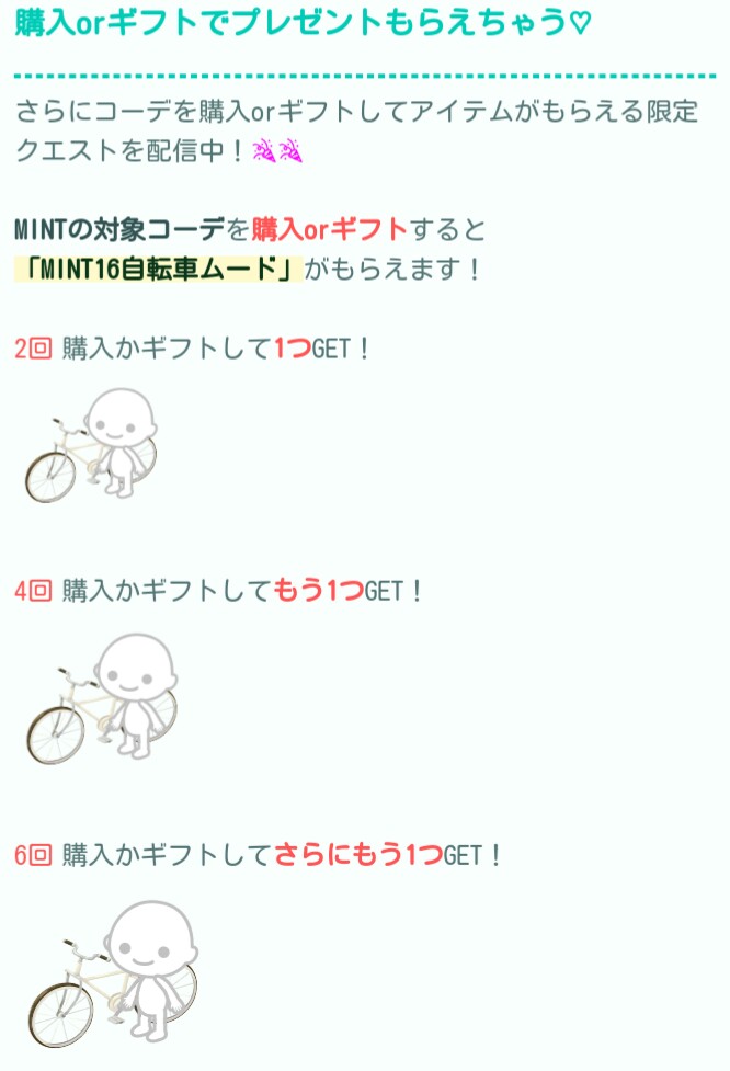 そして今まで影が薄かったからなのか、今まで登場したMINT内容も一部復刻して購入できるうえに、今回はその復刻内容購入でも限定の自転車ムードがもらえるっぽそうです\(^o^)/
