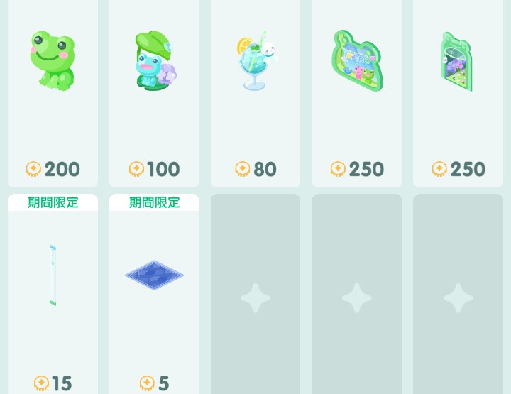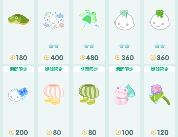 無料ショップ内容では有料と違う点は、頭乗せのカエルとカエルの傘が売られていないという事で、☆2設定がムードのみという状況でしたφ(`д´)メモメモ…