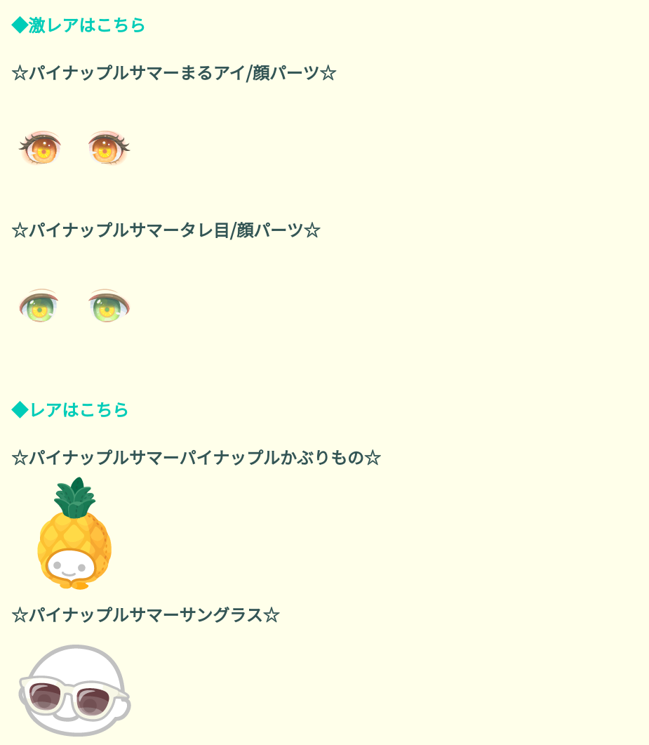 激レア設定では相変わらずの瞳の中にモチーフのパイナップルの輪切りがあるくらいでデザイン自体はほぼどちらもただの色違いと変わらないくらいの内容にログインボーナスで貰える顔パーツの目とさほど変わりもないと思えるので敢えて狙う価値はあるとは言い切れないので残念ですね┐(´д`)┌ヤレヤレ