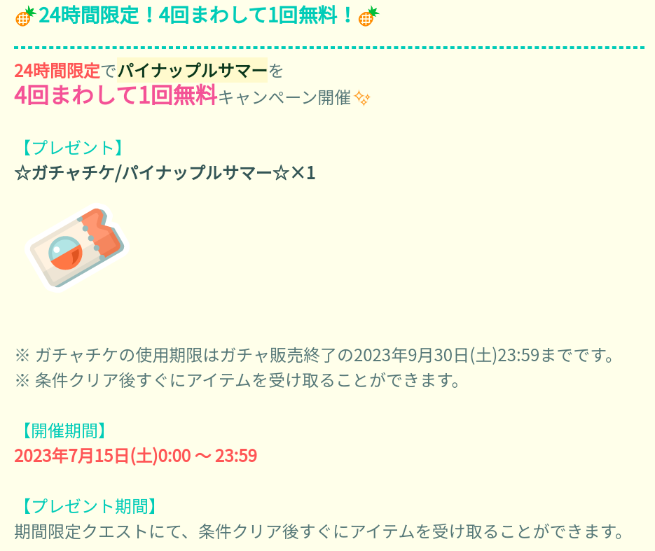 販売開始から24時間限定のクエストとして4回まわせばこちらのパイナップルサマーのガチャチケが貰えるという事なんだけど~正直この1日限定でガチャチケが貰えてもこの魅力の薄いガチャを焦って回すメリットがないので他の有料ガチャのガチャチケならともかくこれを連ガチャを回すに至らないキャンペーン過ぎて『コレジャナイ感』がパないシステムばっかり作らないで欲しいwって思いました( ゚д゚)ソレナ