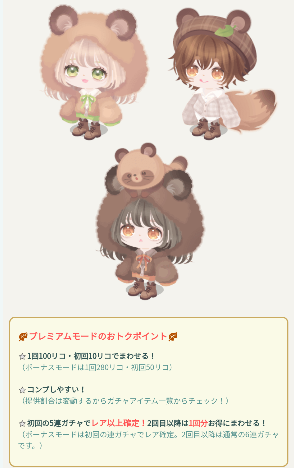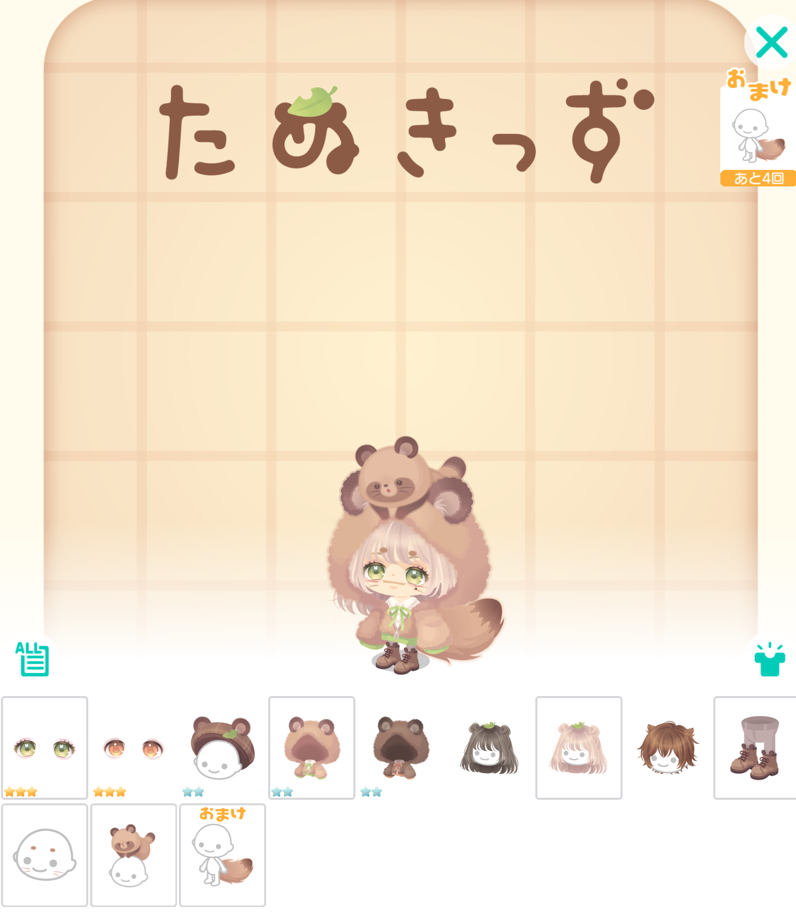 こちらでは特に秋というくらいで何の変哲もないシステムも顔パーツしかない有料無料選択ガチャより「たぬきっず」が登場したので記録していきますね(^_-)-☆