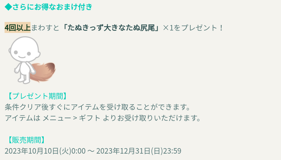 おまけ内容ではこのガチャ唯一普通だと思える内容として有料も無料も初回の連ガチャで貰えるたぬ尻尾が4回で貰えるという事でここだけは文句はないって感じですね( ゚д゚)ソレナ