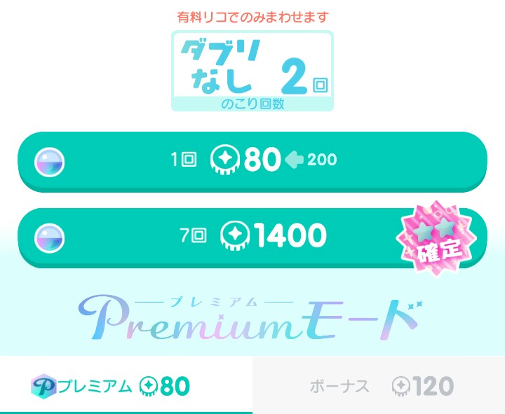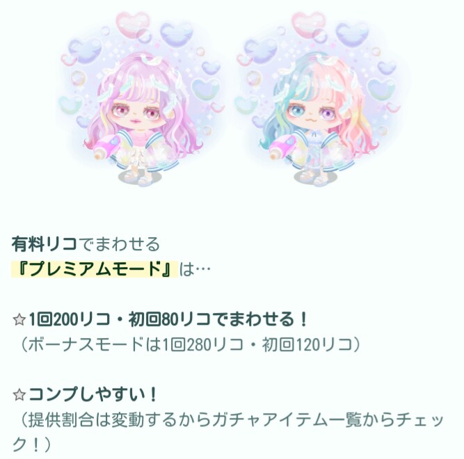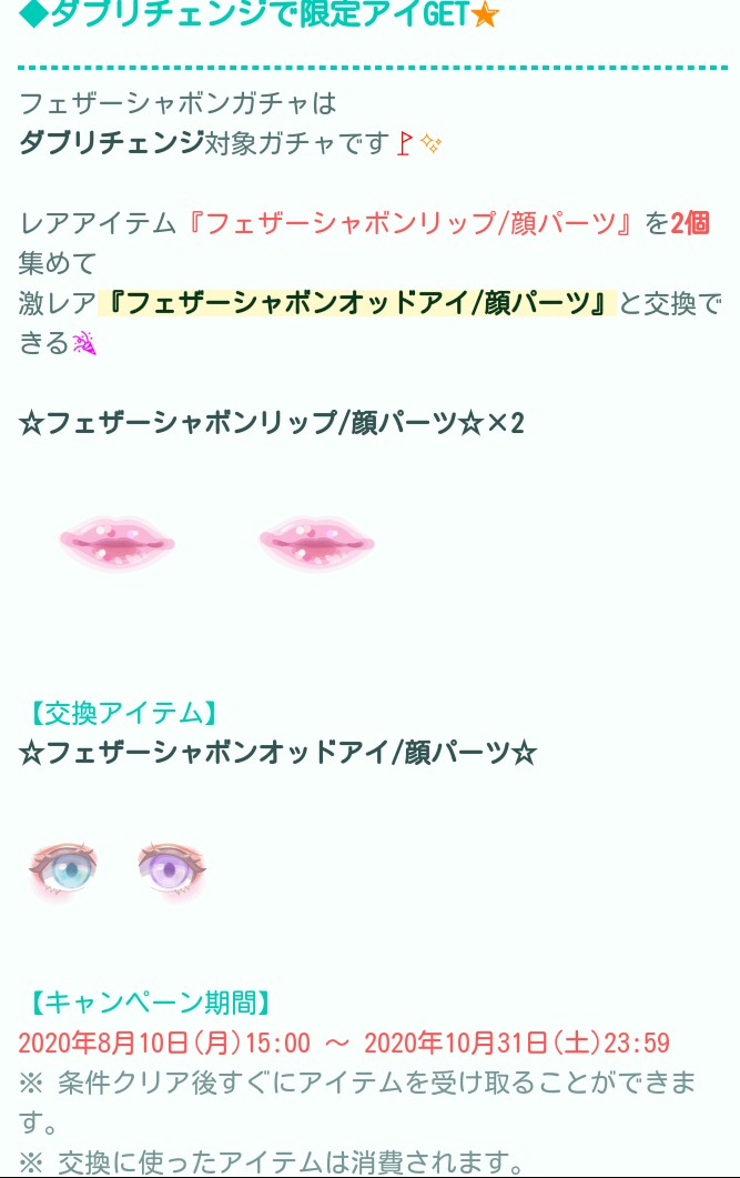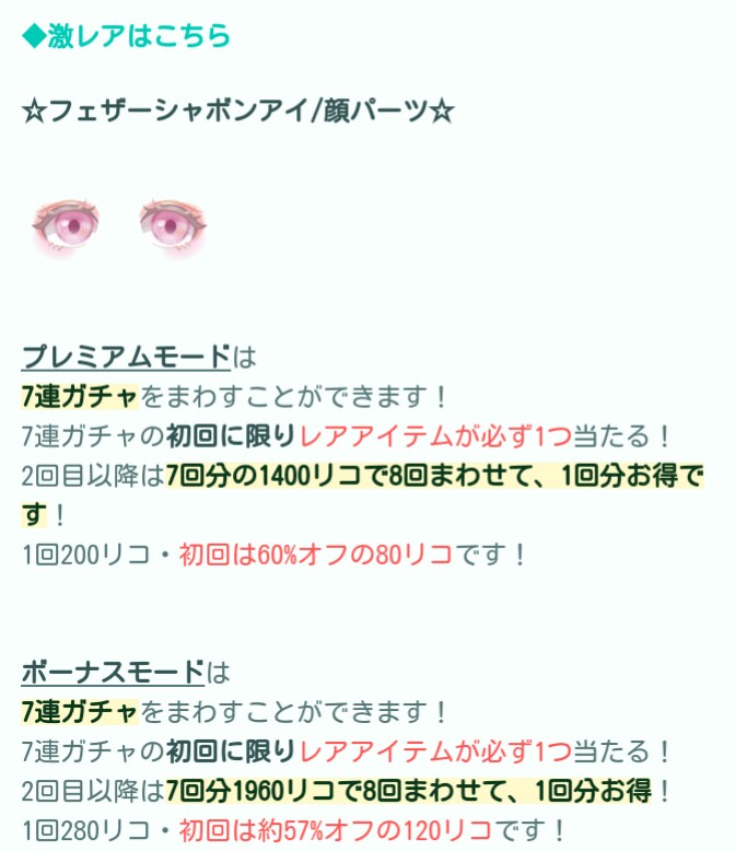 今となってはこうかん機能ですら需要がない有料無料選択ガチャの顔パーツの目だとして、連ガチャが1,000リコ以下でも回そうとおも思えない状況な上になおさら低クオリティ内容なのでよりよくリコの無駄遣いって感じましたね…(-_-;)