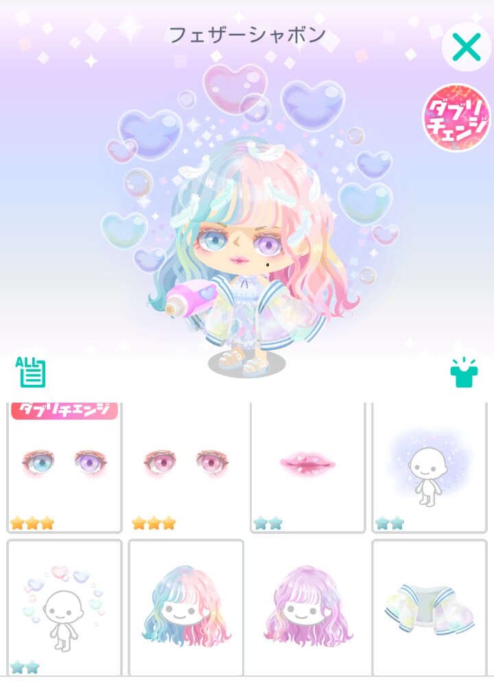 ダブリチェンジを強いて狙うとして初回の連ガチャでこのリップ(口パーツ)が2個以上出たらそのまま顔パーツの目と交換するならまだ良いかなレベルだと思いました((´∀`*))ヶラヶラ
