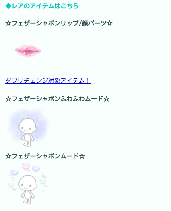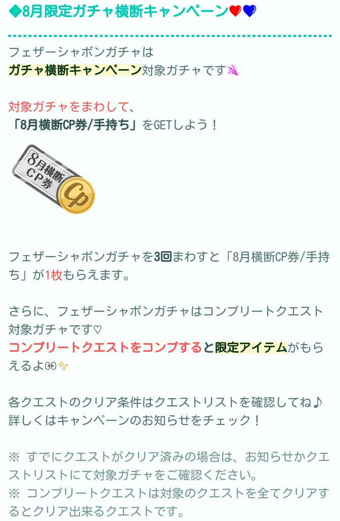 コチラでは8月の第2週目で有料無料選択ガチャより「feather shabon」が登場したので記録していきますね(^_-)-☆